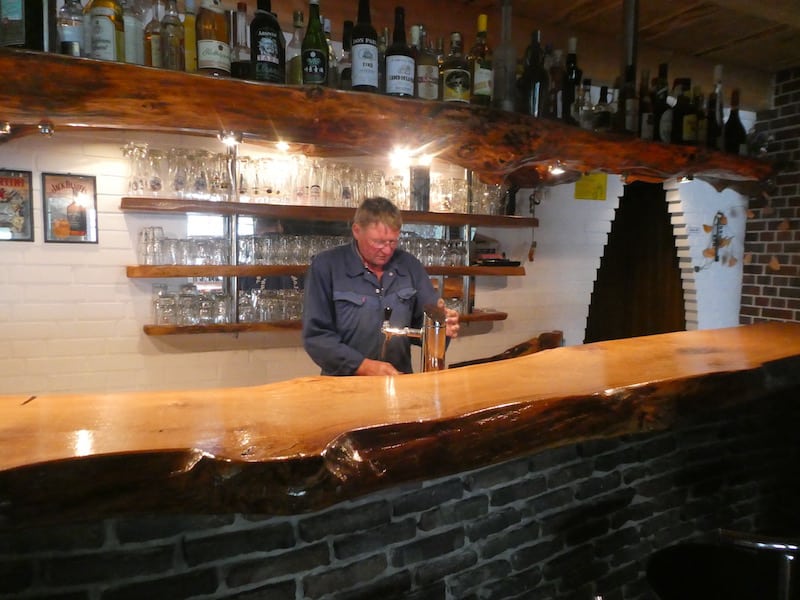 Unser erster Durst wird durch ein von Reinhard frisch gezapftes Bier gelöscht, noch dazu vom Haus spendiert. Den Tresen hat er selbst aus einem Eichenstamm fabriziert. Das ist Teil eines Raumes, der für Feiern zu mieten ist.