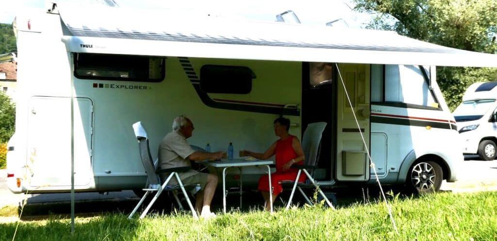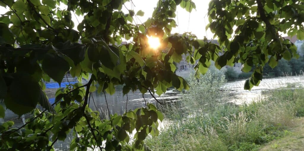 So ganz stillhalten kann Michael sich dann doch nicht lang und er geht wenigsten die paar Schritte zum Doubs vor unserem Stellplatz.
