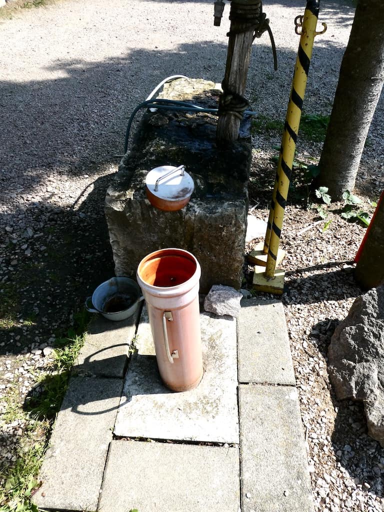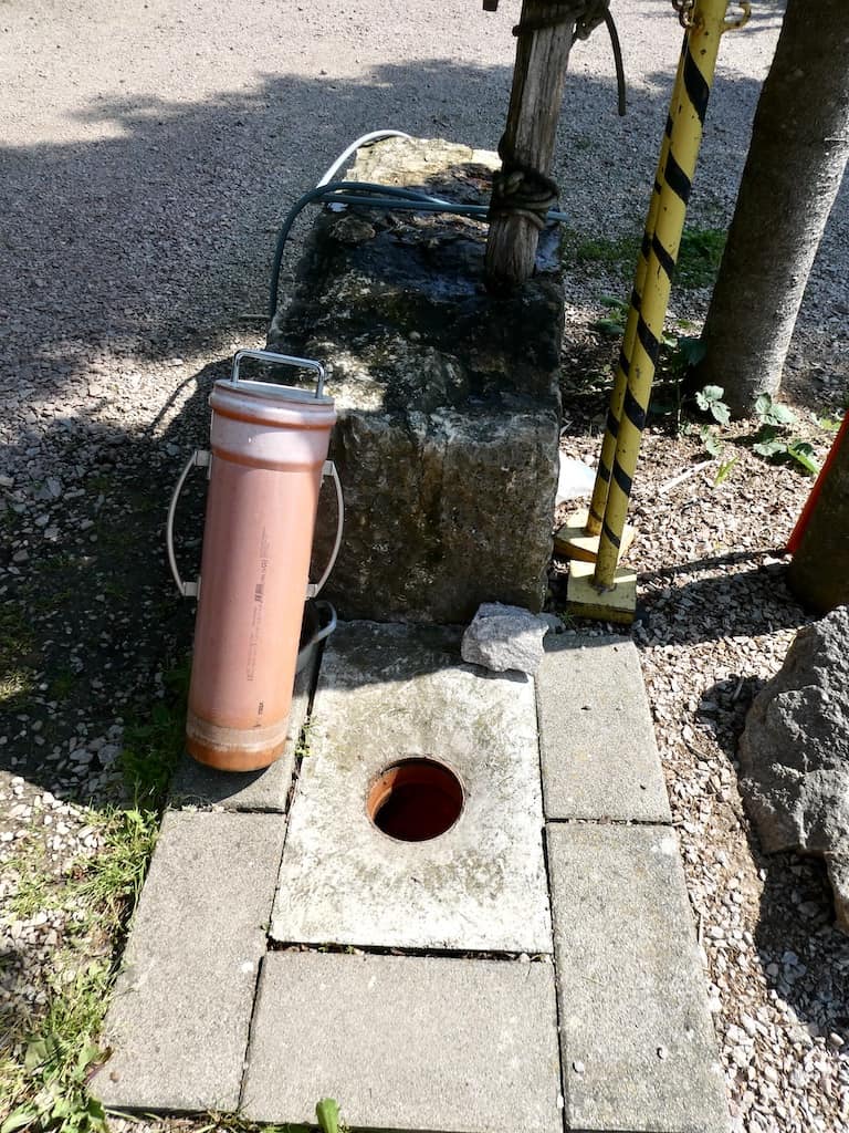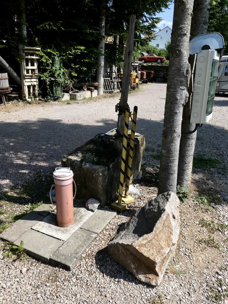 Auf diesem Stellplatz gibt es eine ebenso einfache, wie geniale Entsorgungsmöglichkeit. Zum Entleeren der Toilettenkassette nimmt man den Decken von diesem Rohr. Zum Ablassen des Grauwassers wird einfach das ganze Rohr entfernt. Auch Frischwasser gibt es hier kostenlos. Strom ist für 2 Franken pro Tag zu haben. Wir brauchen das nicht, solange die Sonne so reichlich scheint.