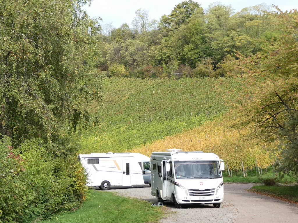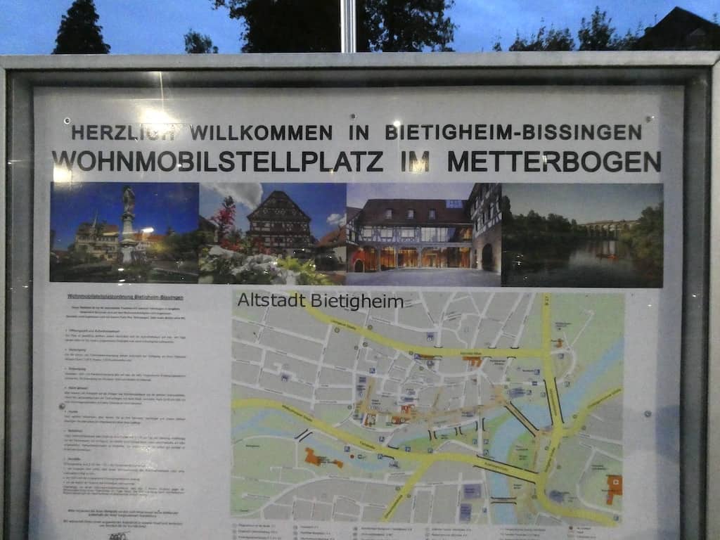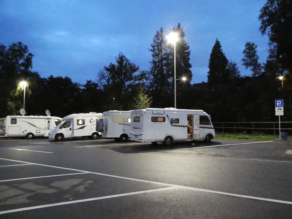 So fahren wir (viel zu spät) los auf Stellplatzsuche. In Besigheim ist es uns an einer vielbefahrenen Strasse jedoch zu laut. So landen wir in Bietigheim-Bissingen auf einem Stellplatz der Stadt. Sicher auch nicht ganz ruhig, aber während der Nacht hoffentlich doch ruhiger. Die Regengeräusche sind auch schön einschläfernd, solange es nicht zu kräftig schüttet. Ein guter Schlaf wird wohl auch durch unseren heutigen Wandertag gefördert, – und der Schlummertrunk zeigt hoffentlich auch seine Wirkung.
