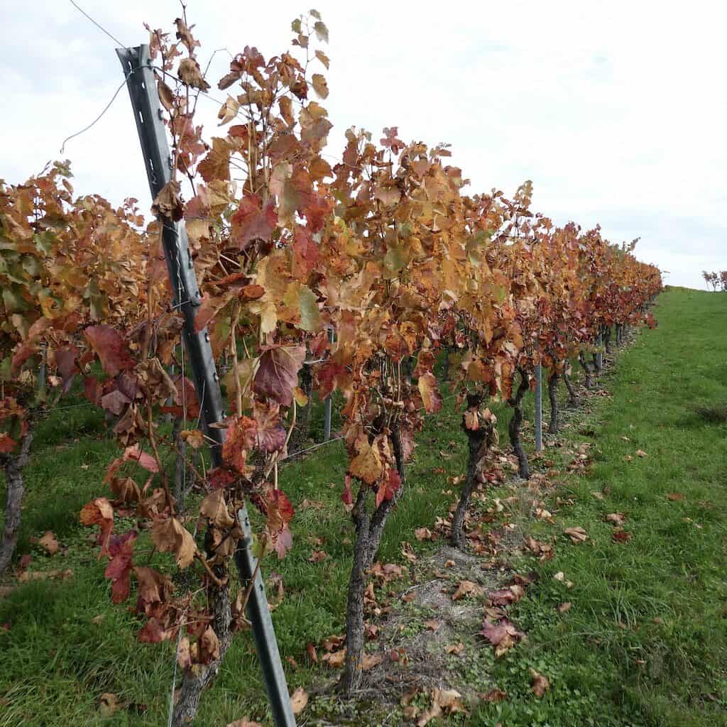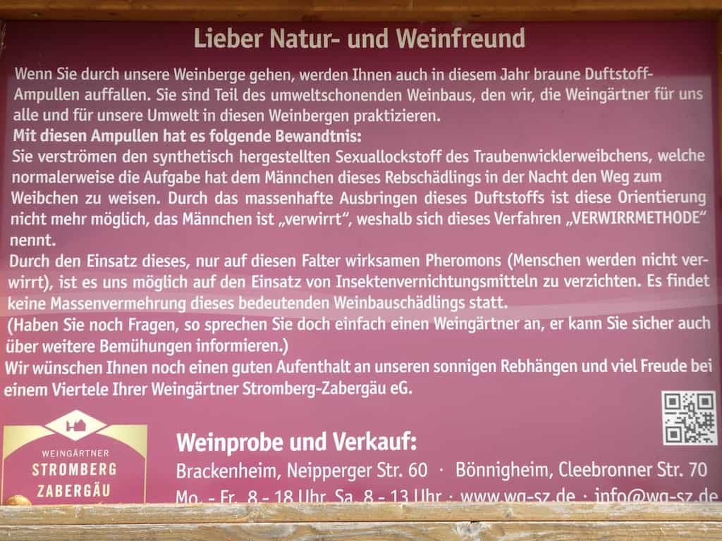 Wir erfreuen uns an den verschiedenfarbigen Rebstöcken. Es ist auch interessant zu erfahren, wie die Schädlingsbekämpfung hier mit einer Verwirr-Methode offenbar erfolgreich abläuft.