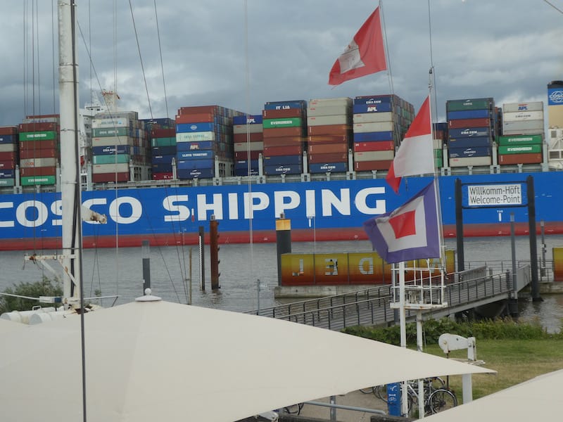 Nebst anderen kommt auch noch dieser riesige Containerfrachter vorbei. Unvorstellbare 13’500 Container hat er geladen.