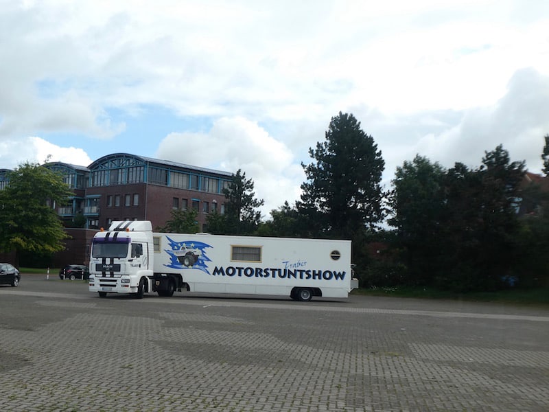 Auf dem Stellplatz in Glückstadt treffen heute zwei Mega-Camper ein. Die Leute der Graber Motorstuntshow warten hier, bis der Platz ihrer nächsten Show frei wird.