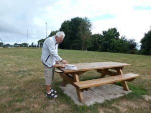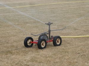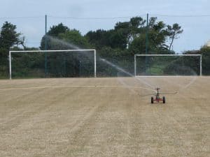 Beim Frühstück beobachten wir, wie sich der Rasensprenger langsam über den Sportplatz arbeitet. Das müssen wir uns näher ansehen.