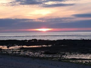 Die Sonne geht nicht ganz am Horizont unter, aber malerisch ist das allemal. Die Felsen im Vordergrund werden in einigen Stunden unter Wasser sein.