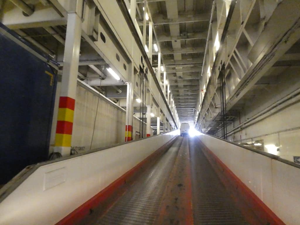 Über eine steile Rampe geht es in den Schiffsbauch hinein und innerhalb geht es noch weitere steile Rampen aufwärts bis auf’s 7. Deck.