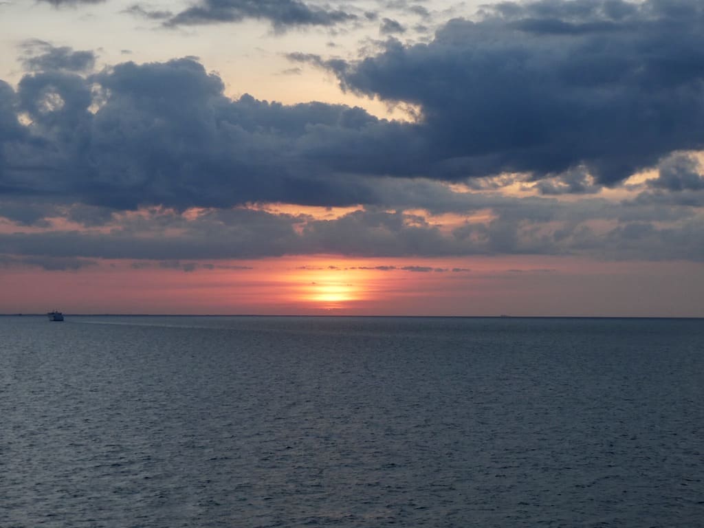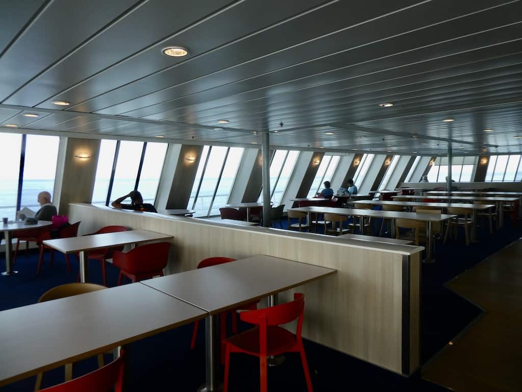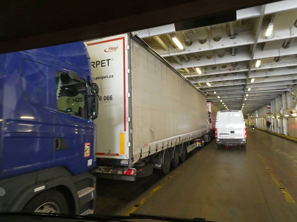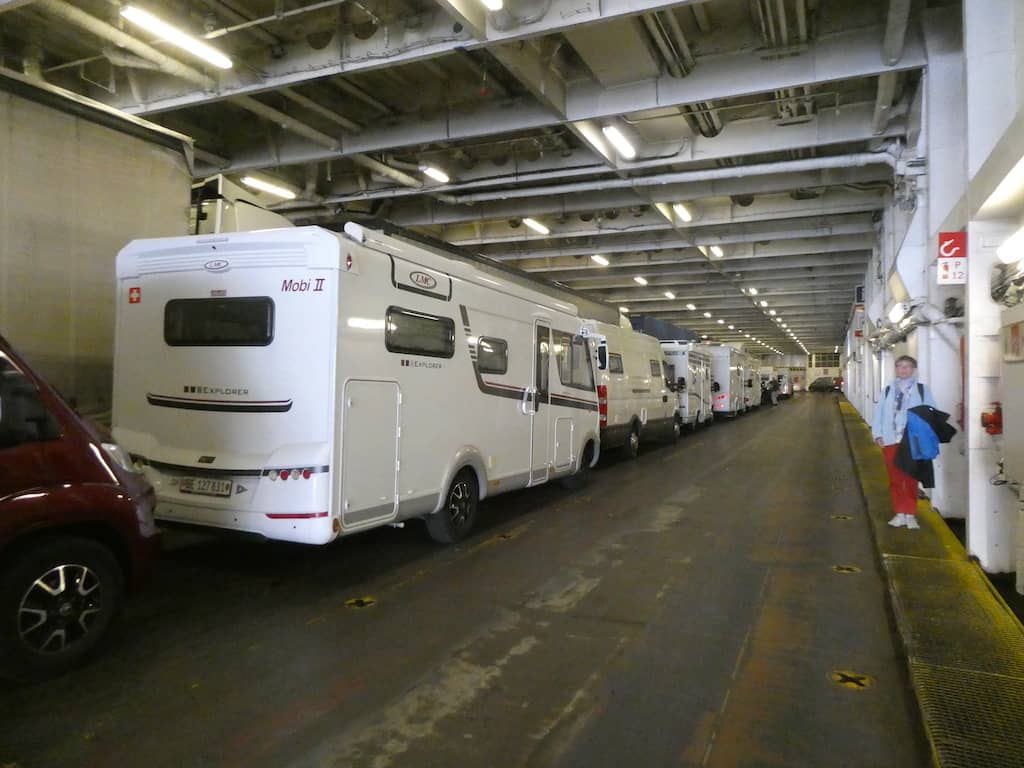 Wir sind viel früher da. Aber das Einchecken und die Passkontrolle gingen auch früher los. Es reichte uns gerade noch, unser Müsli-Mittagessen zu beenden, da konnten wir auch schon auf die Fähre fahren. Ein riesiger Koloss.