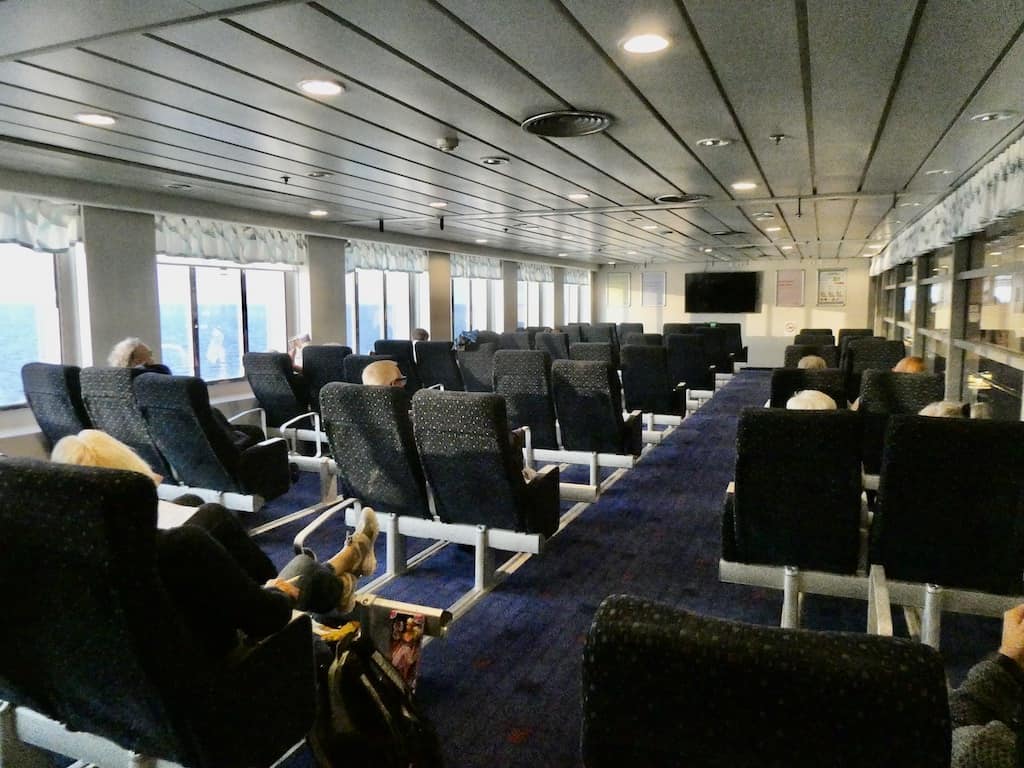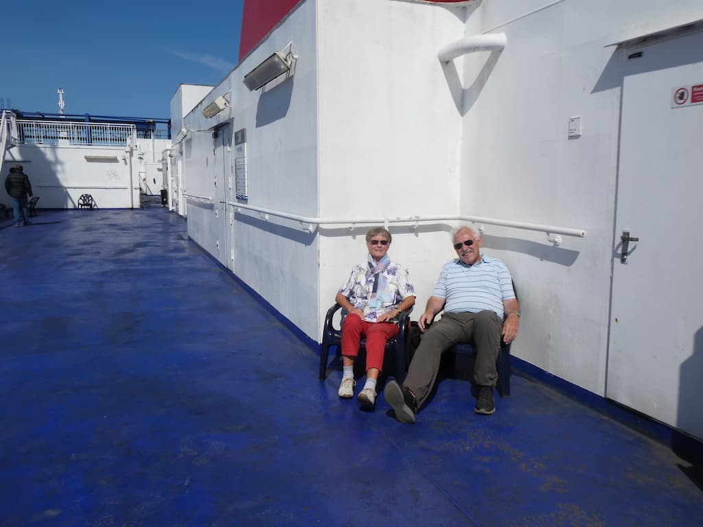 Superpünktlich legt die Fähre ab. Wir finden eine windstille Ecke, aber schon bald wird es uns zu heiss in der Sonne.