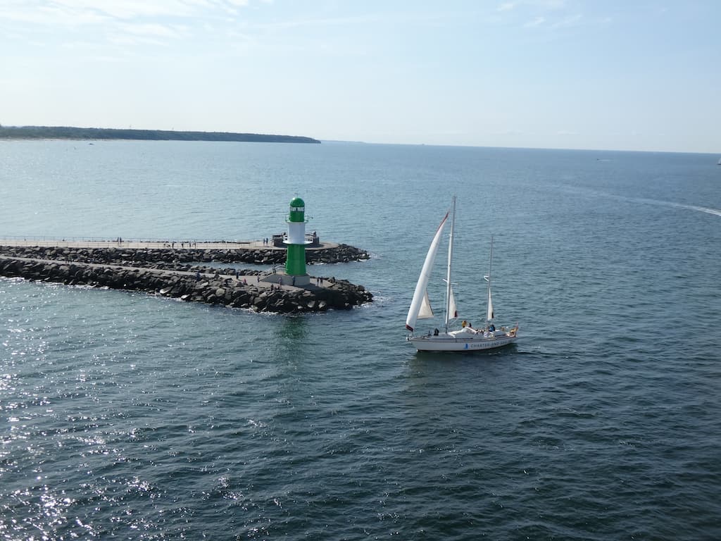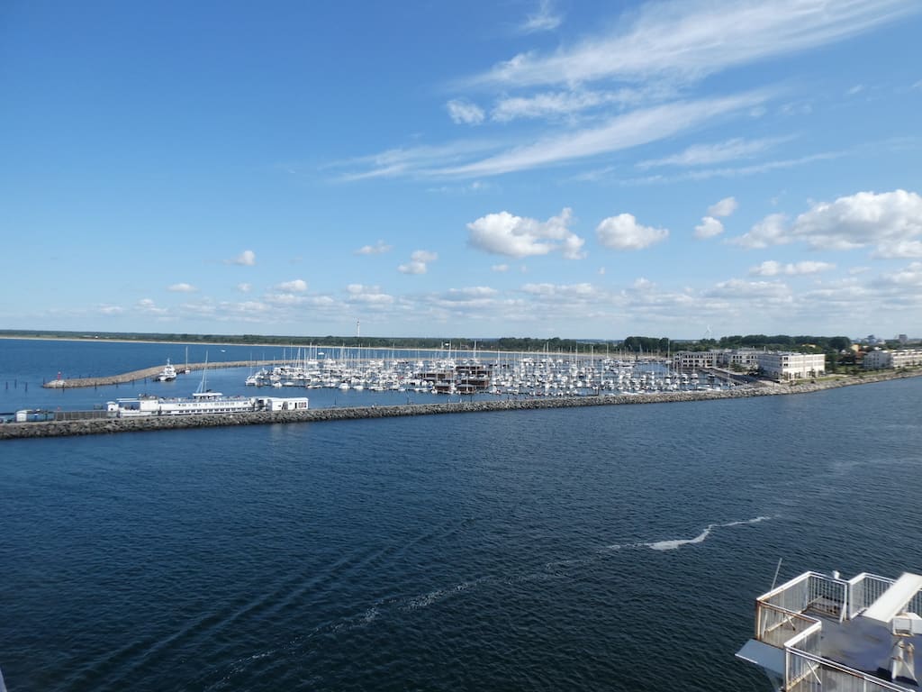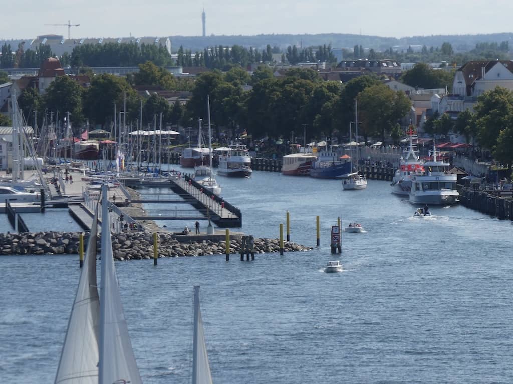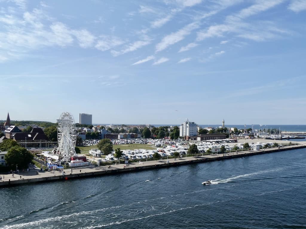Nun kommt eine interessante Passage an Warnemünde vorbei. Michael war hier schon mehrmals auf Segeltörns mit Dieter auf seiner Yacht „Freedom“. Der Hafen «Hohe Düne», wie auch der «Alte Strom», wecken aus dieser Perspektive schöne alte Erinnerungen. Zweimal hatten wir das Glück, dort, im „Alten Strom, einen Liegeplatz zu finden. Aber auch zu Land und sogar mit dem Mobi waren Renate und Michael schon mehrfach hier. Renate schwärmt heute noch von den feinen Fischbrötchen.