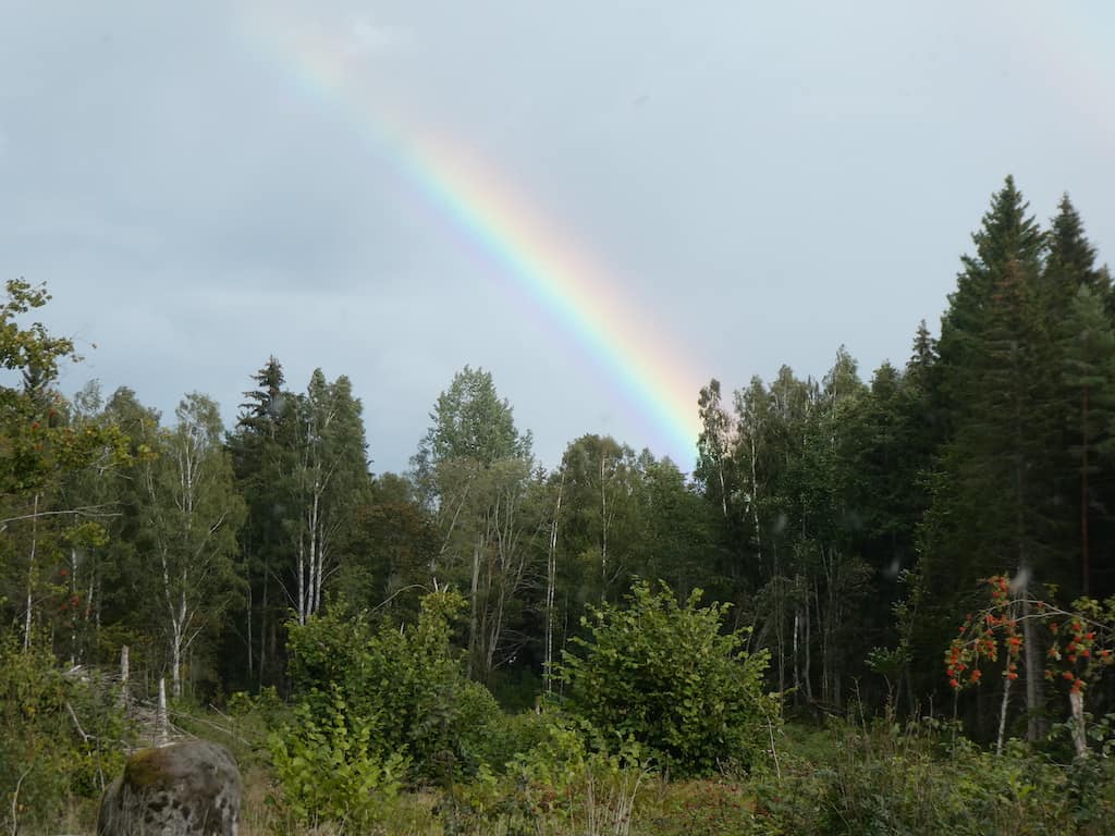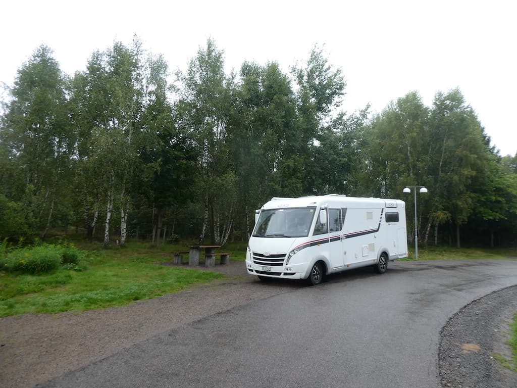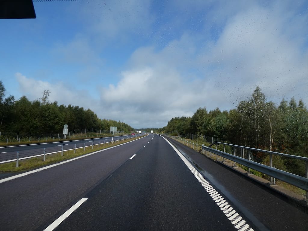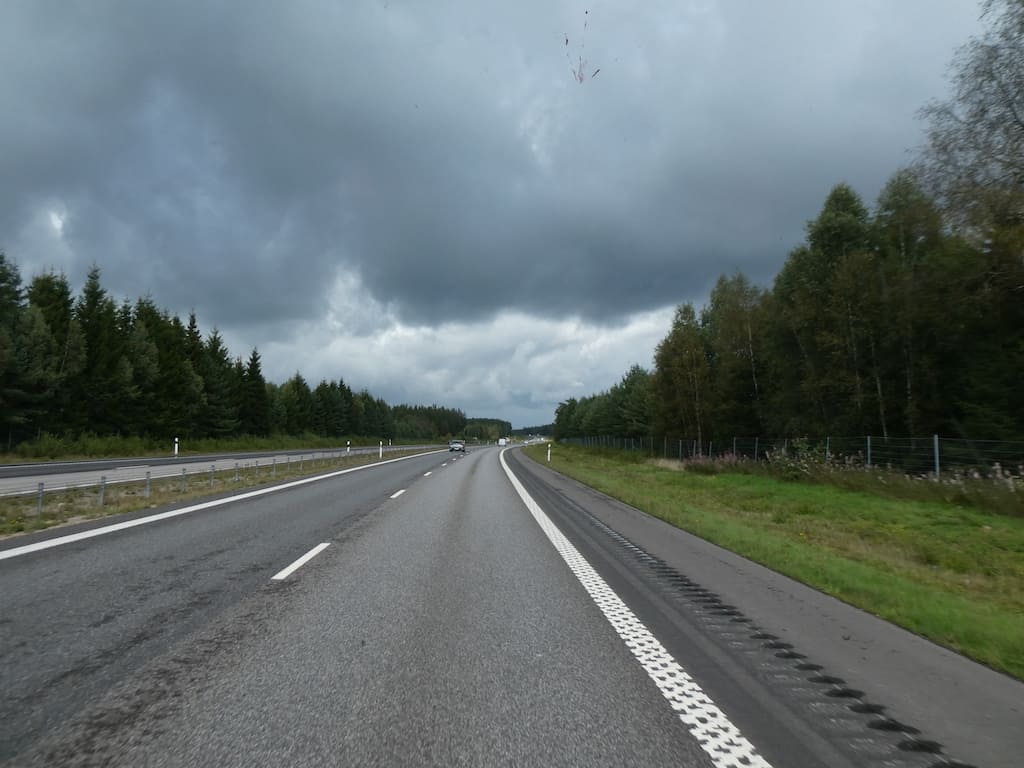 Für unsere Mittagspause fanden wir einen ruhigen Platz abseits der Autobahn. Auch hier erwischte uns wieder ein Regenguss. Grundsätzlich scheint es in Schweden keine Tankstellen, Park- und Raststätten direkt an der Autobahn zu geben. Man fährt von der Autobahn ab auf eine mehr oder weniger entfernte Anlage.