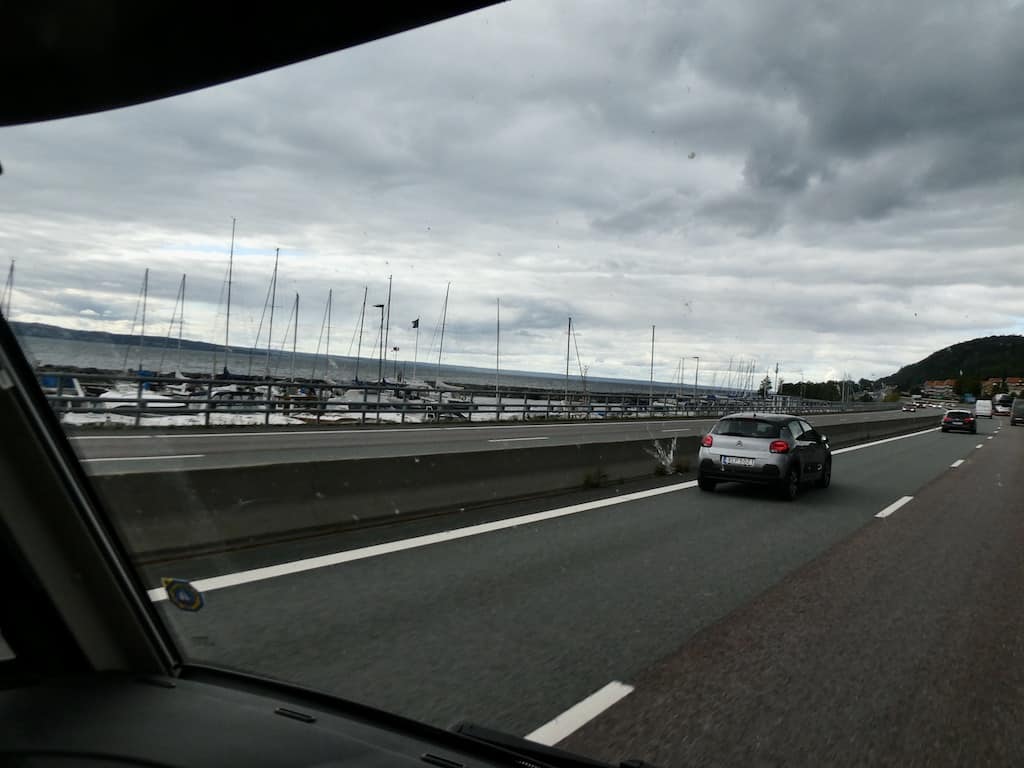 Die Autobahn führt hier eine Weile ganz nahe am See Vättern vorbei.