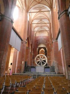 Die hohen Backsteinsäulen sind sehr imposant. Das Mittelschiff ist 37 Meter hoch.