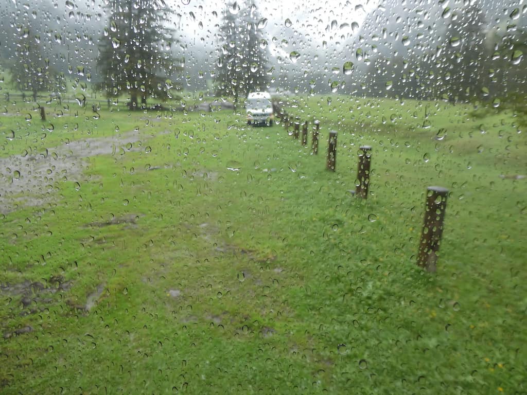 Sollten wir hierbleiben und den Regen aussitzen? Kommen wir überhaupt aus der aufgeweichten Wiese heraus?