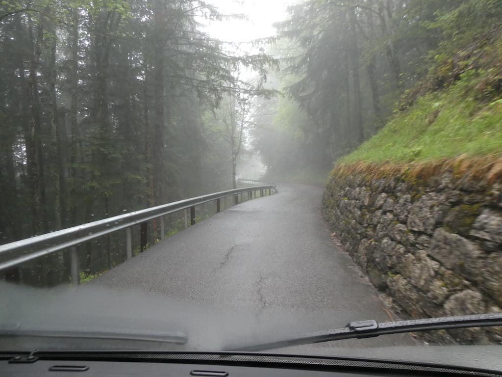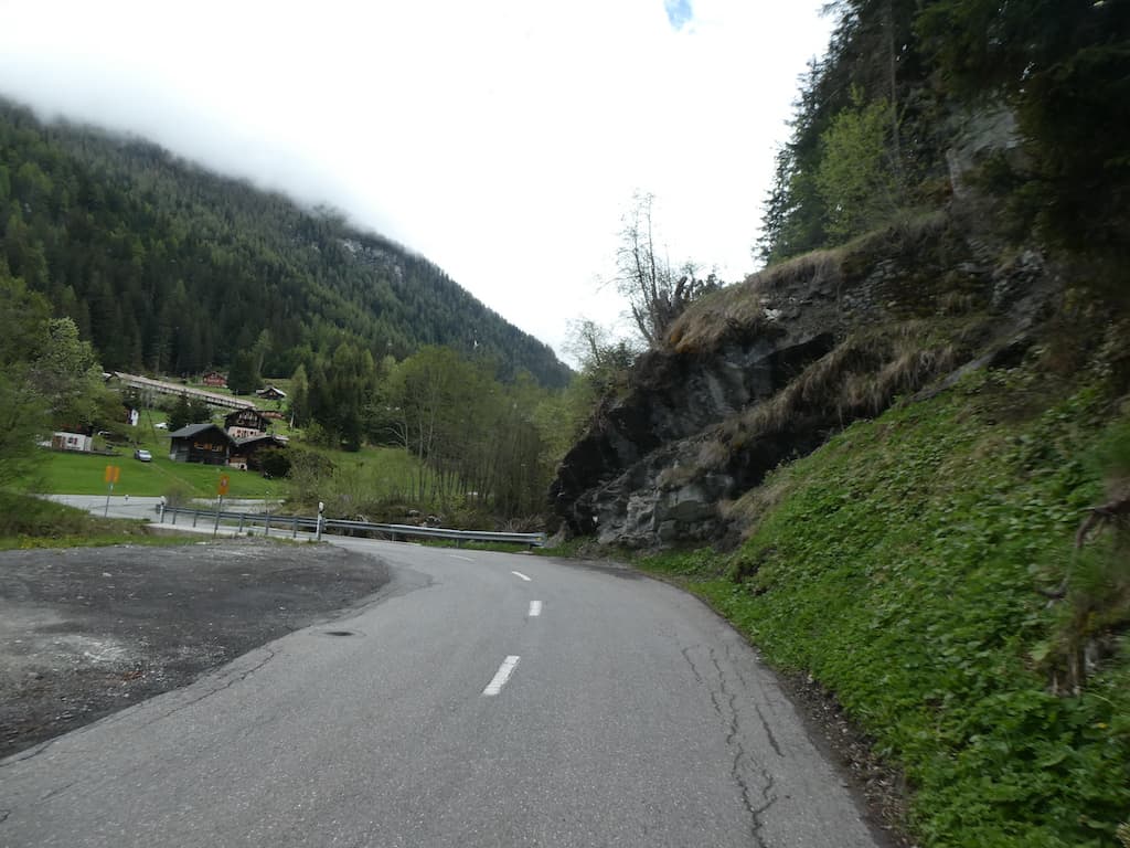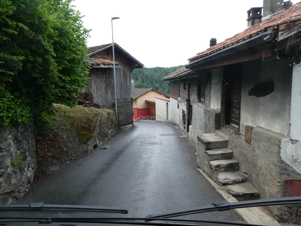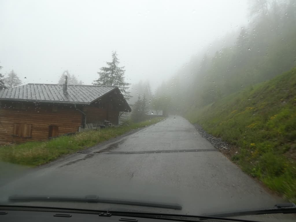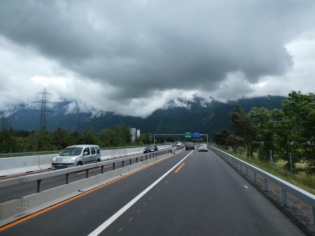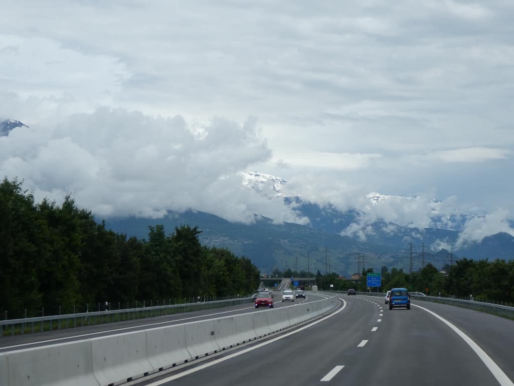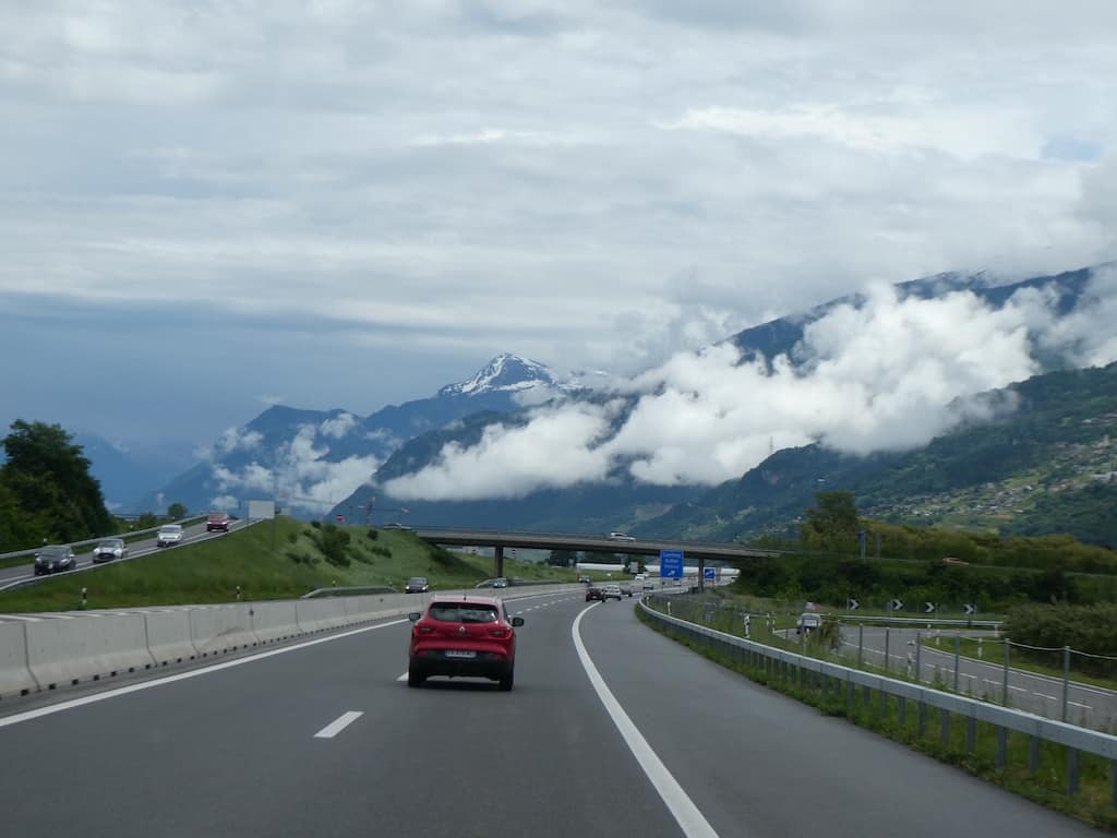 Unter den Wolken ist besonders die enge kurvige Strasse der Grund, warum wir nur langsam hinunter in die Rhoneebene kommen. Immer wieder müssen wir uns mit dem Gegenverkehr einigen.