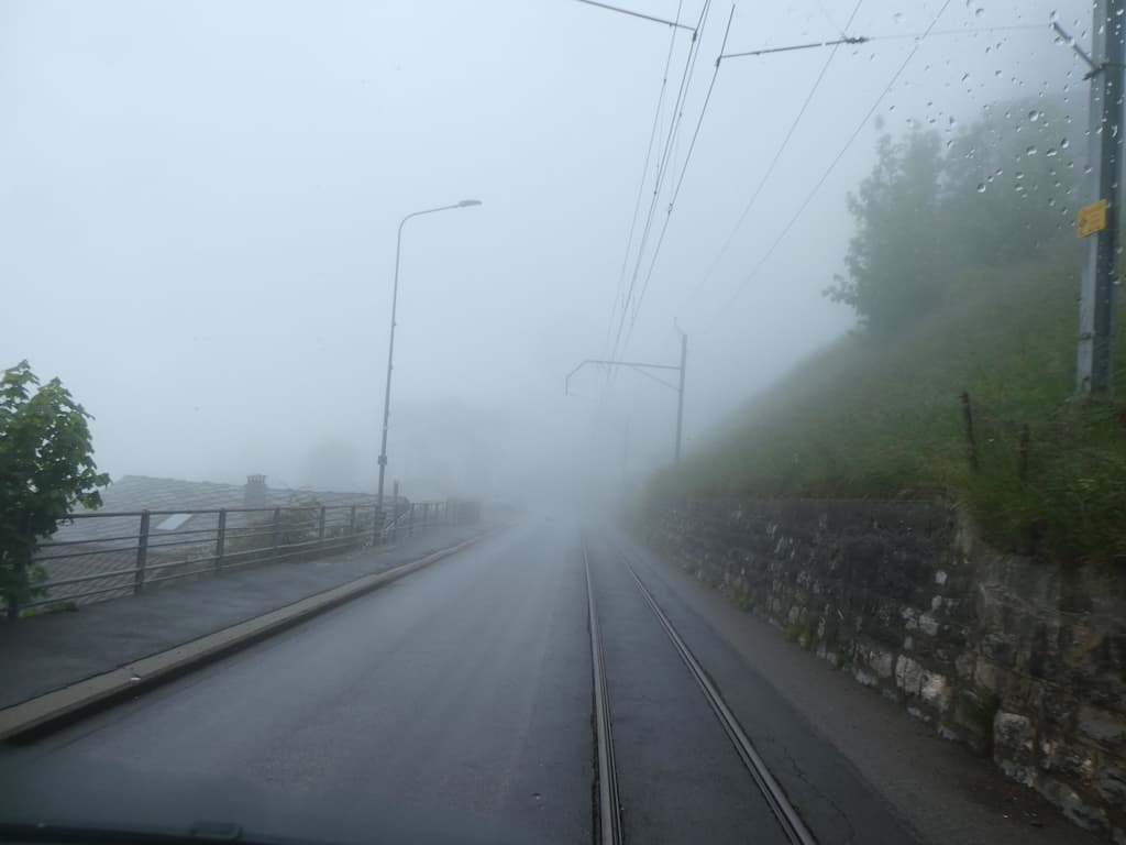 Die Talfahrt beginnt im Nebel. Ganz gemütlich bis Gryon, wo wir sogleich die Entsorgungsstelle aufsuchen. Der Wasserhahn ist allerdings immer noch abgestellt.