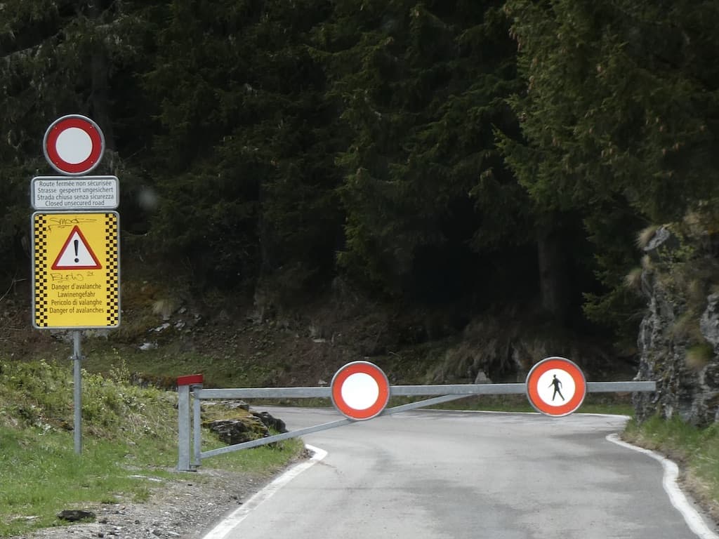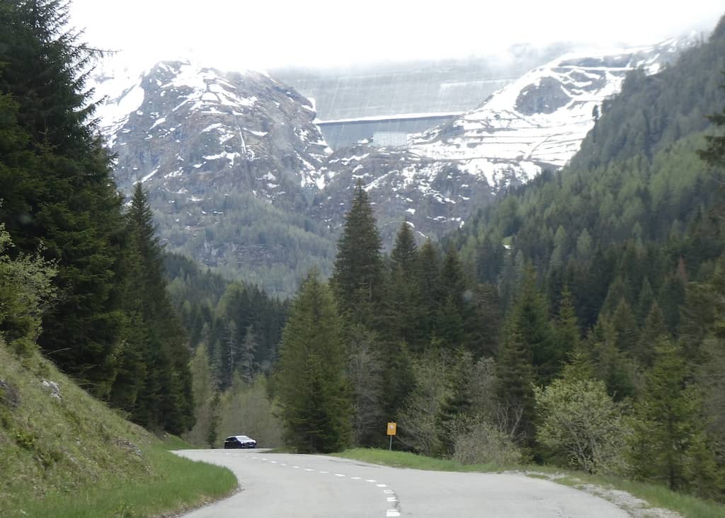 Bald sehen wir in der Ferne die gewaltige Staumauer. Nur noch 5 Kilometer, dann haben wir es geschafft. Hatten wir gedacht, denn plötzlich versperrt eine Barriere die Weiterfahrt. Vermutlich ist noch Wintersperre.