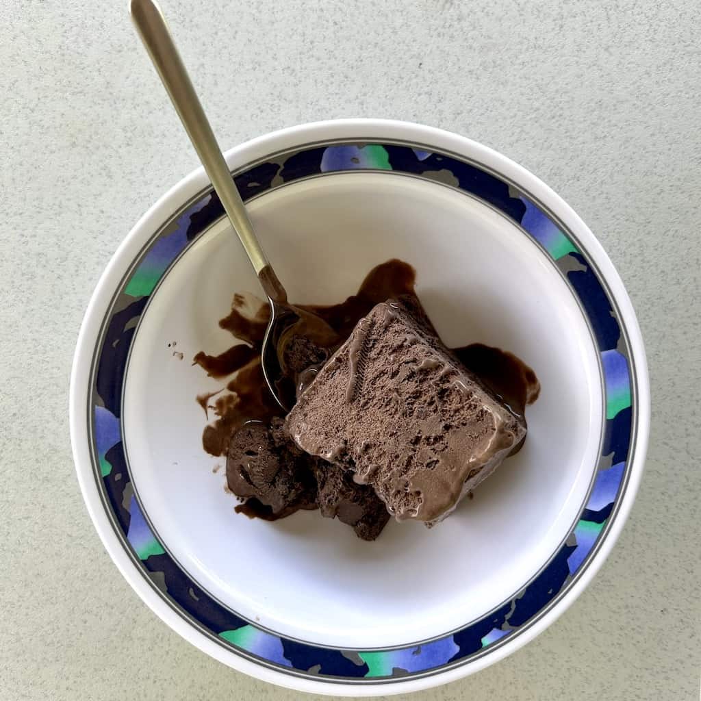 Dafür gab es zum Nachtisch Schokoladeneis. Dies mussten wir rasch essen, bevor es uns im Teller wegschmilzt.