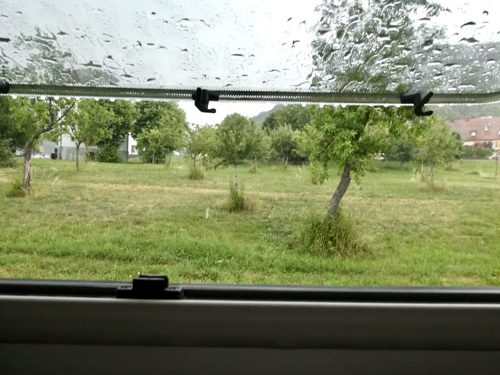 Erst ganz fein, dann aber schüttete es so kräftig, dass wir unsere Fenster nicht mehr so weit geöffnet lassen konnten. Die Dachluken sowieso. Es kühlte herrlich ab auf etwa 21°. Was für eine Wohltat!