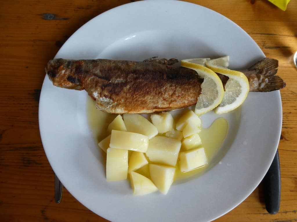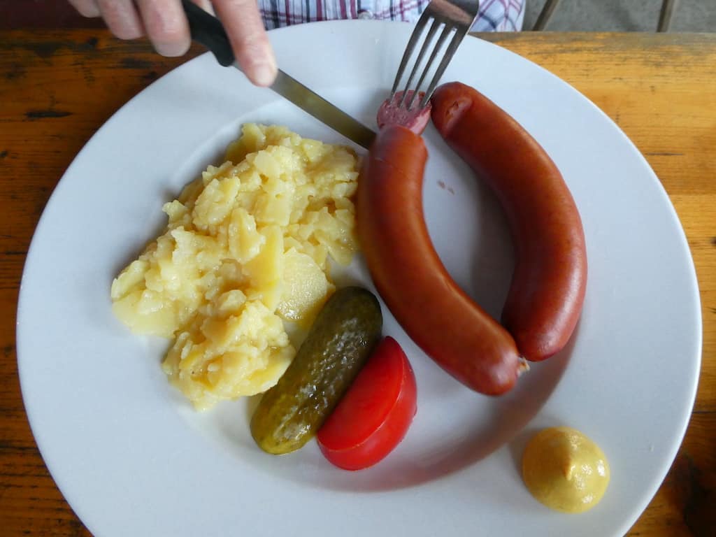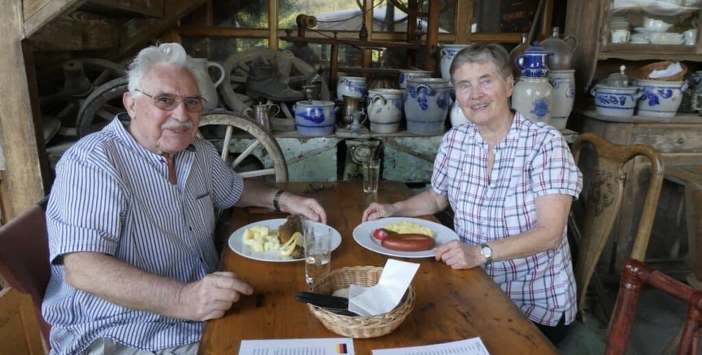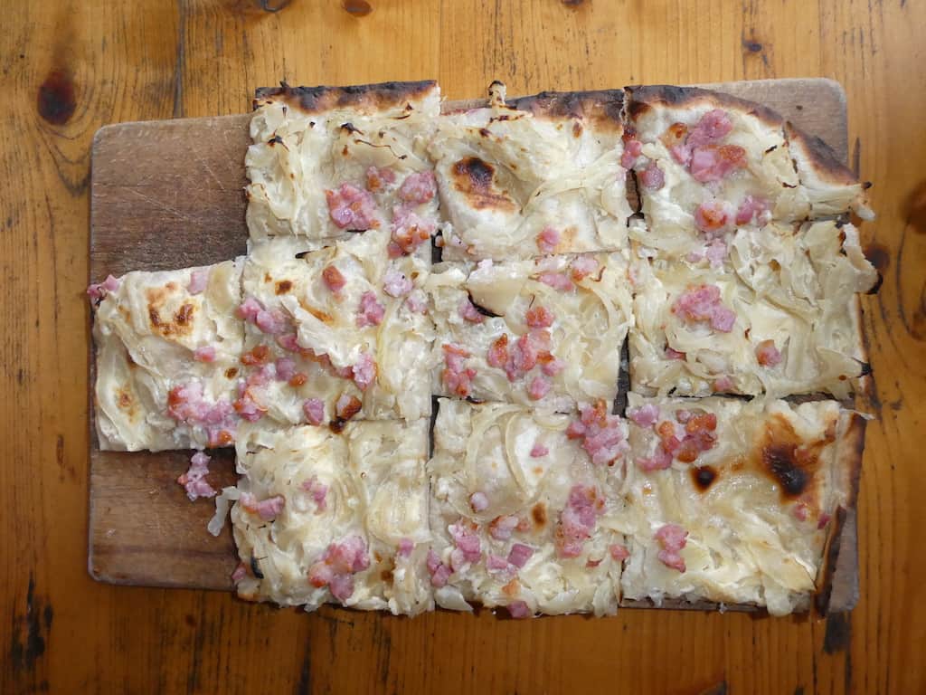 Renate wählt die Bauernwürstchen mit Kartoffelsalat. Michael hat Lust auf eine Forelle. Die ist zwar ausgezeichnet, macht aber nicht wirklich satt. Dafür sorgt dann eine Zwiebelwaie, eine Art Flammkuchen.
