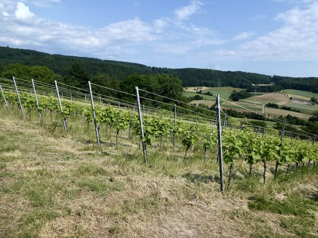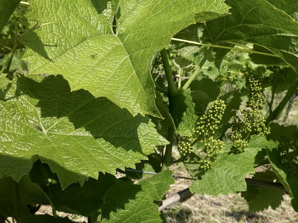 Weiter oben kommen wir in die Weinberge. Noch sind die Trauben unscheinbar klein.