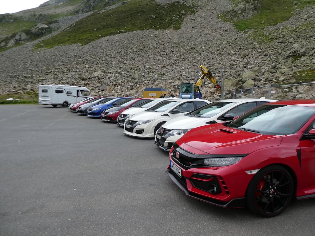 Auf der Passhöhe bekommen wir endlich unser Mittagessen. Der Parkplatz ist ein beliebter Treffpunkt für verschiedenste Fahrzeug-Clubs und Fans