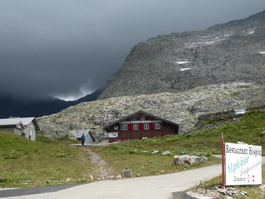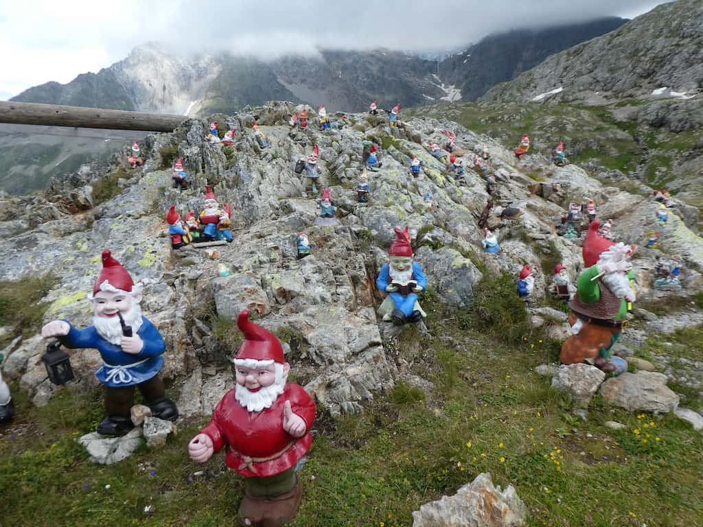 Im Berggasthaus Sustenpass Hospiz auf 2265 m.ü.M. decken wir uns mit Alpkäse ein. Mit 28 Franken pro Kilo zwar kein Schnäppchen, aber sehr fein. Jede Menge Gartenzwerge gibt es auch. Und als Kontrast im Hintergrund der Gletscher.