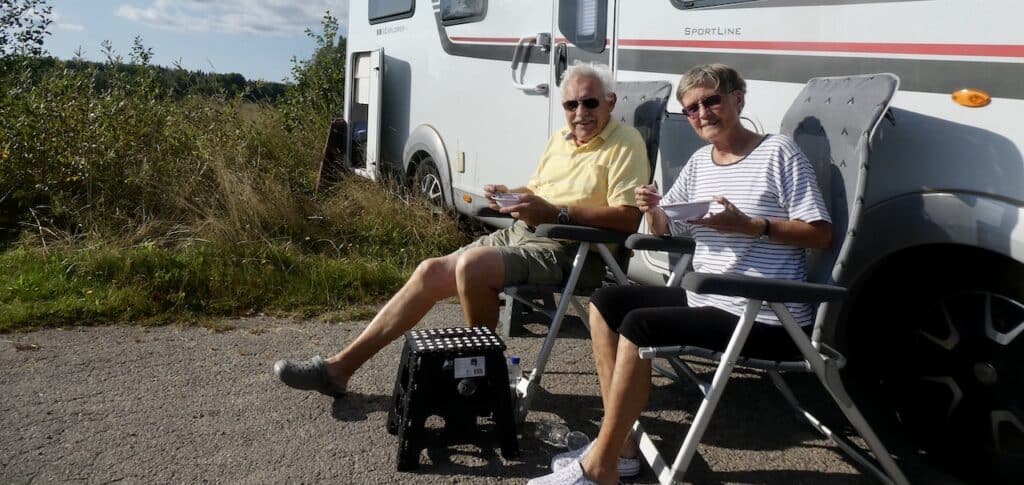 Erstmals, seit wir auf dieser Tour in Schweden sind, sitzen wir einmal vor dem Mobi in der Sonne. Herrlich, – bis wir wenig später allerdings den Sonnenhut aufsetzen. An die Wärme müssen wir uns erst wieder gewöhnen, – machen wir aber gerne.