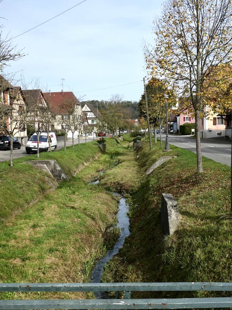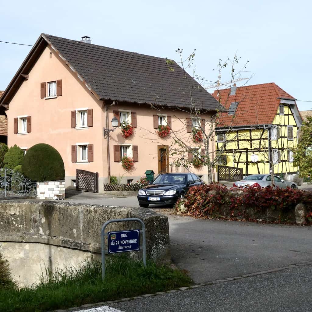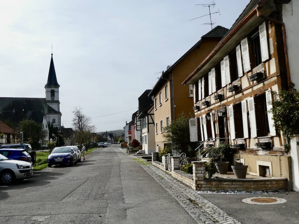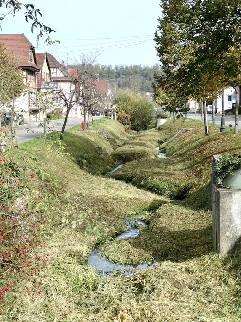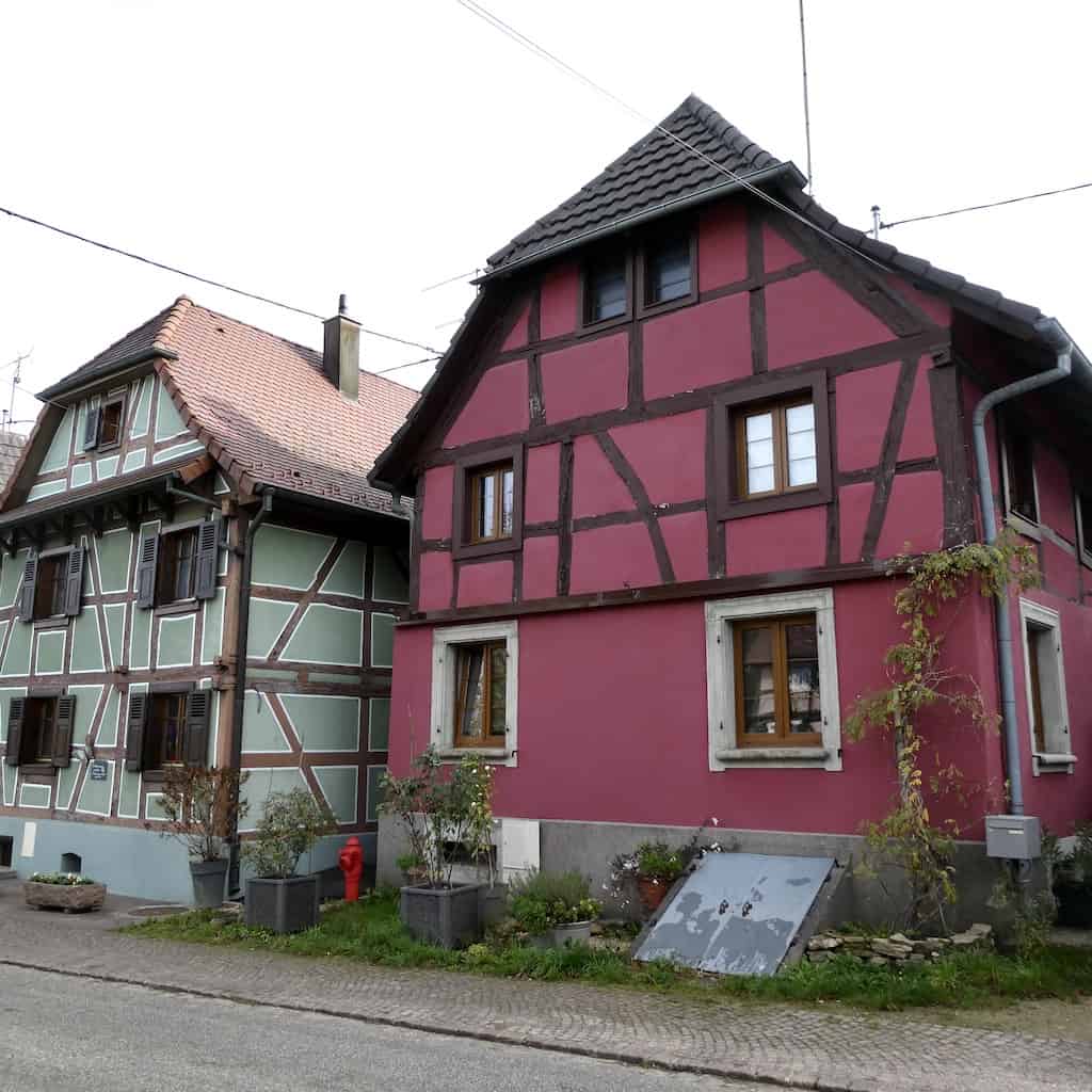 An beiden Seiten des Bachs zieht sich der Ort gefühlt endlos dahin. Nach etwa 1,5 Kilometern kehren wir um. Fast alles sind freistehende alte Häuser, farbig angemalt, wie für das Süd-Elsass typisch.