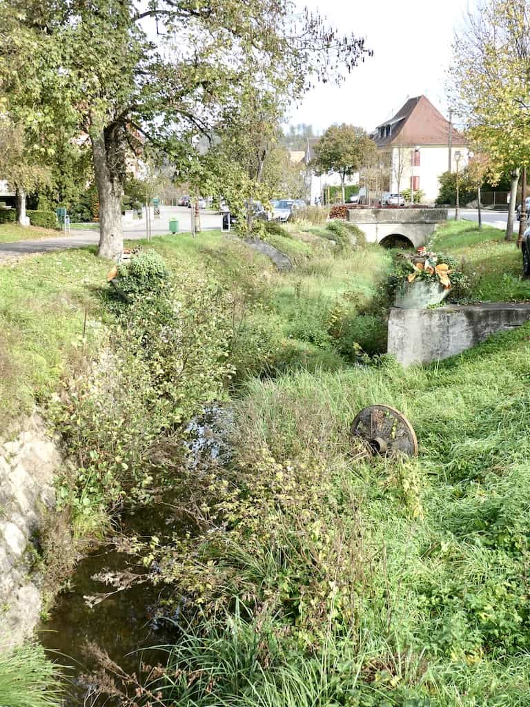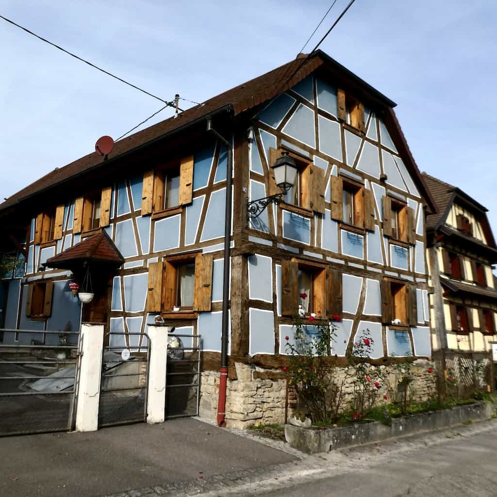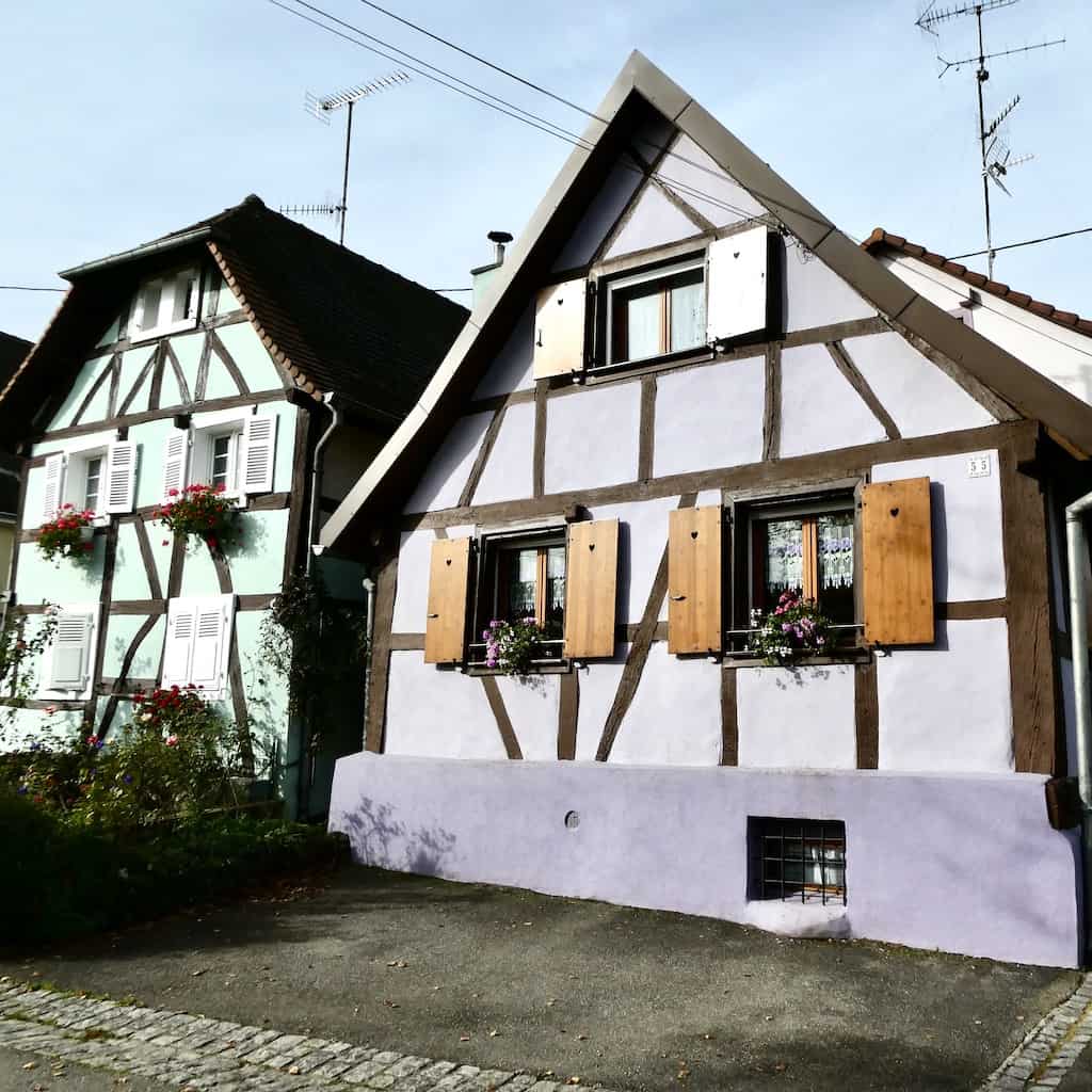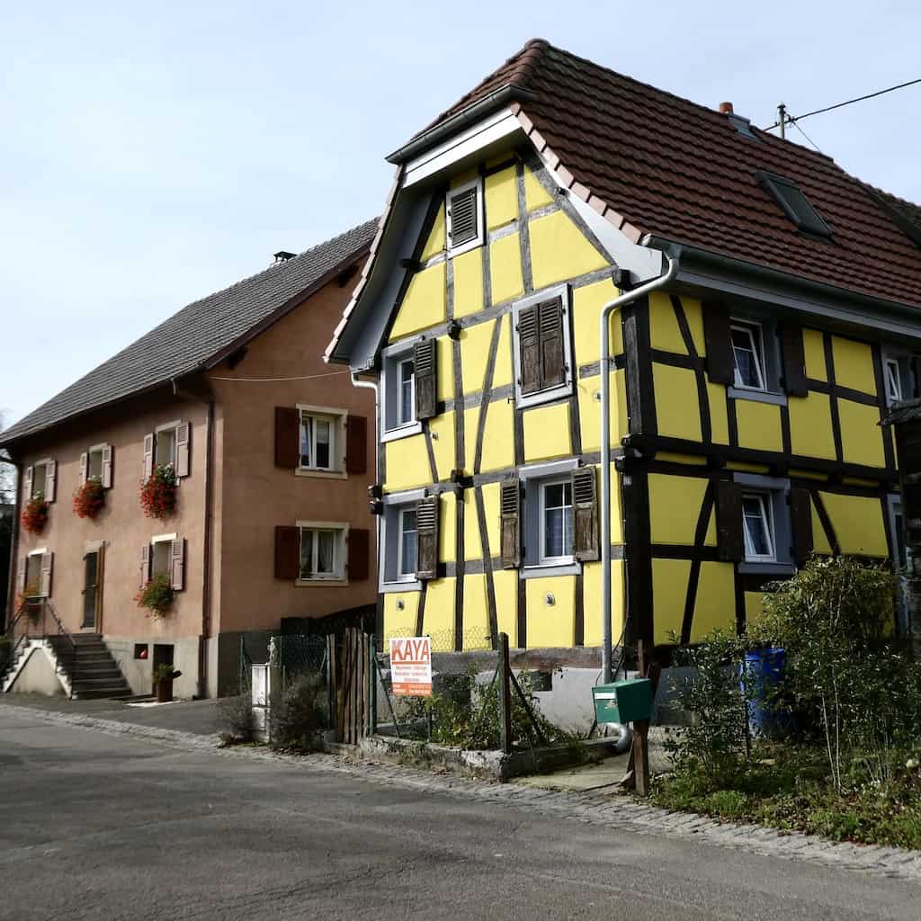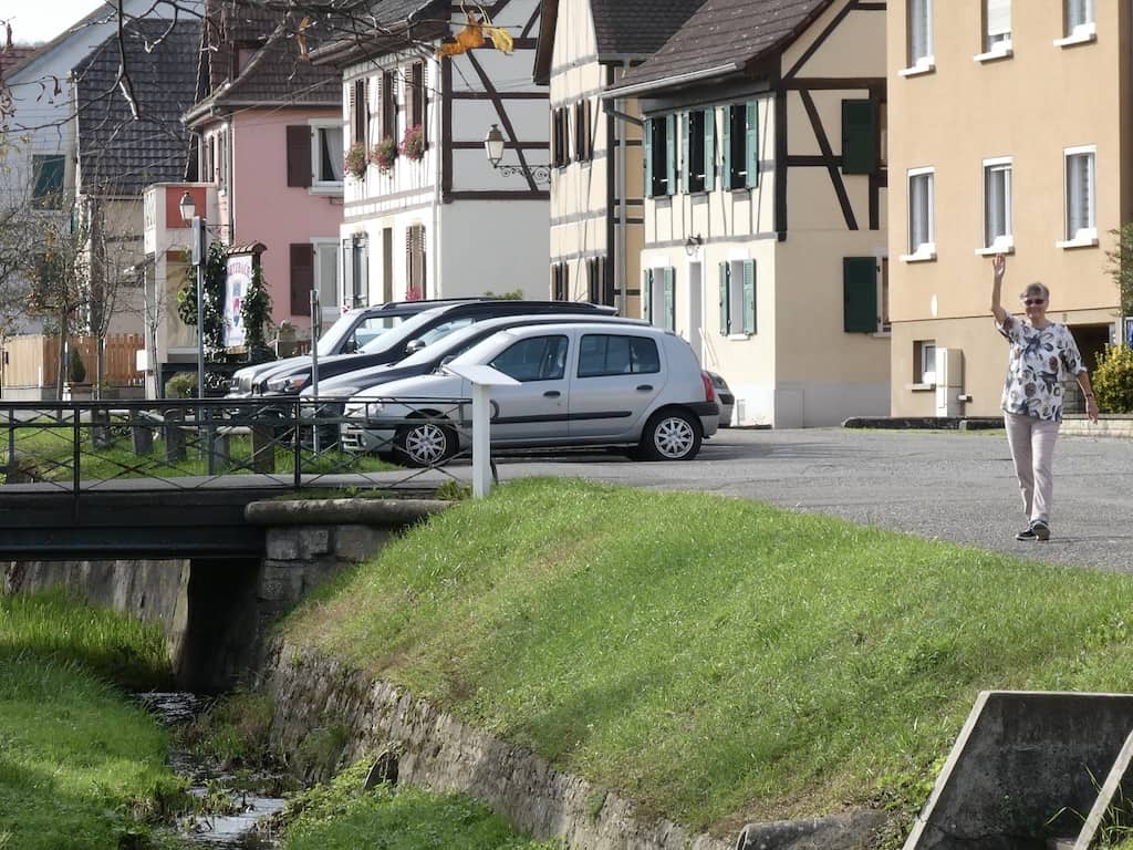 An beiden Seiten des Bachs zieht sich der Ort gefühlt endlos dahin. Nach etwa 1,5 Kilometern kehren wir um. Fast alles sind freistehende alte Häuser, farbig angemalt, wie für das Süd-Elsass typisch.