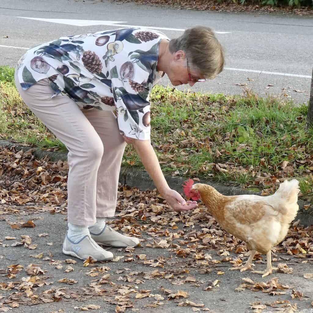 Als wir zum Stellplatz zurückkommen, machen wir Bekanntschaft mit dem «Quartierhuhn». Das ist sehr zutraulich und wird von den Anwohnern verwöhnt, so auch von uns. Vielleicht liegt ja morgen ein Frühstücks-Ei vor unserem Mobi.