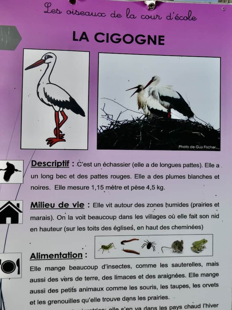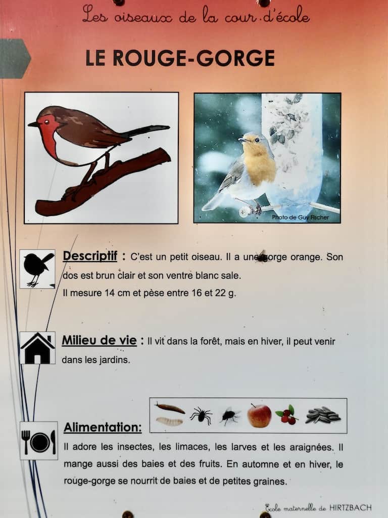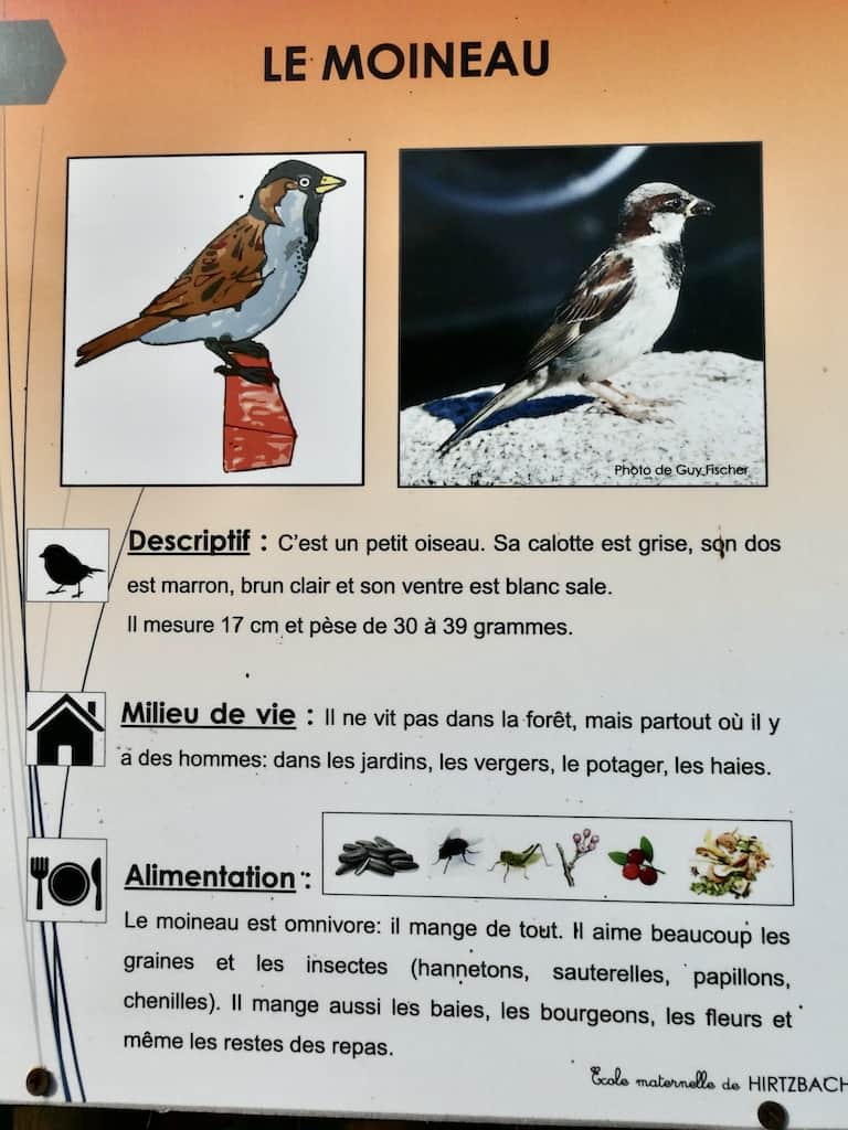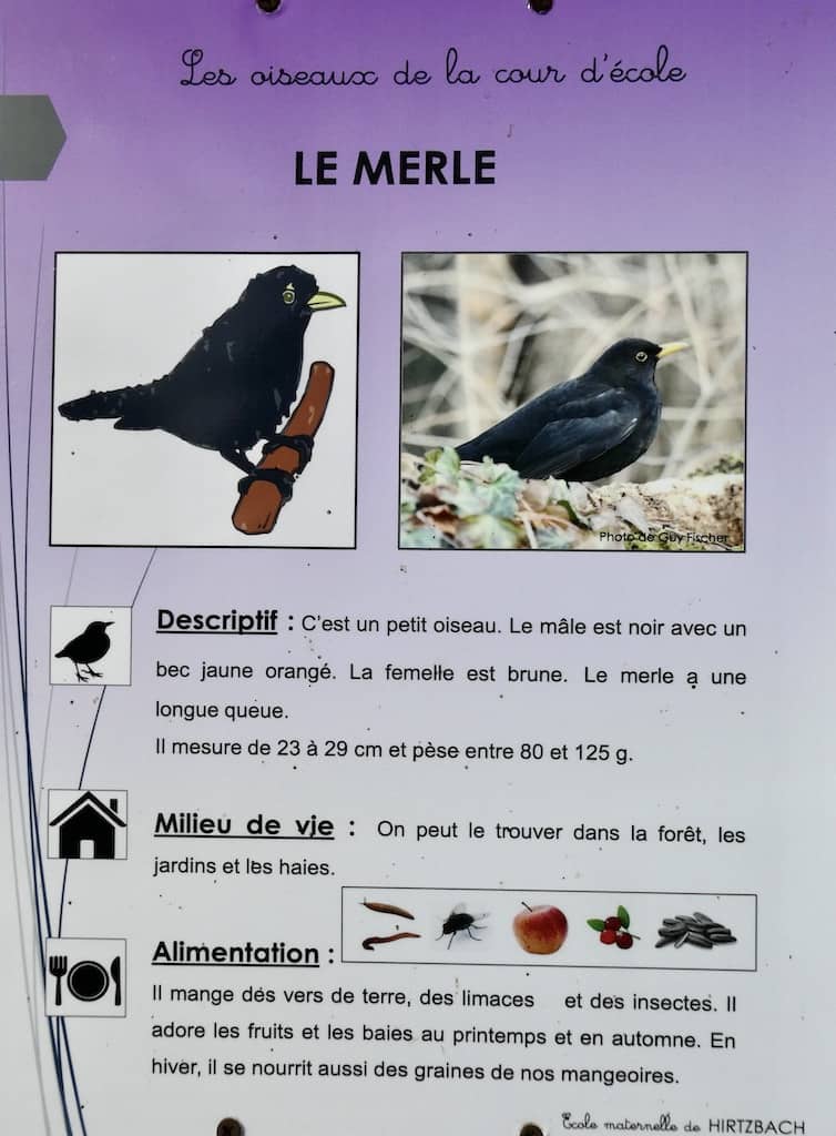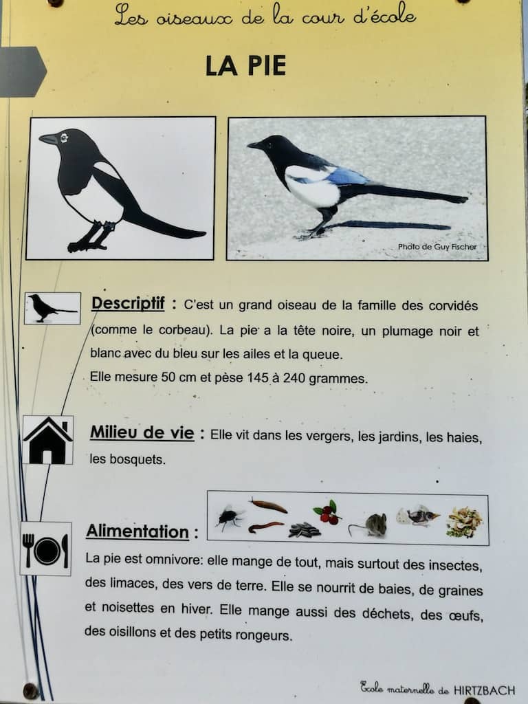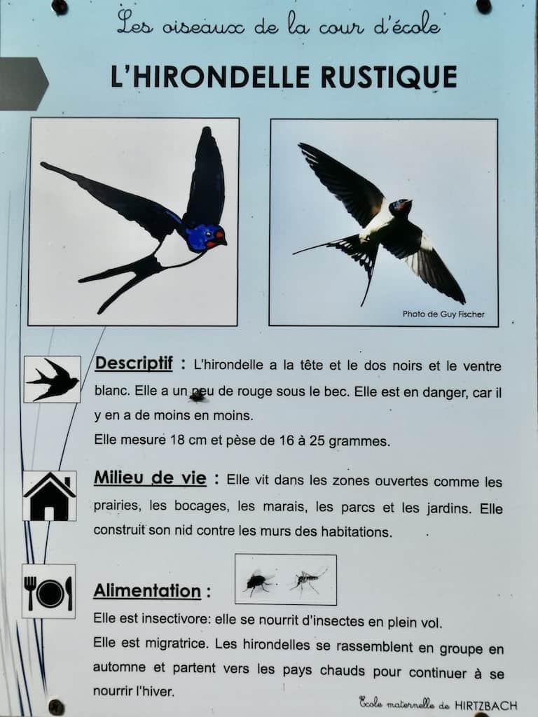 Beim Schulhaus sind am Zaun viele Lehrtafeln über Vögel angebracht.