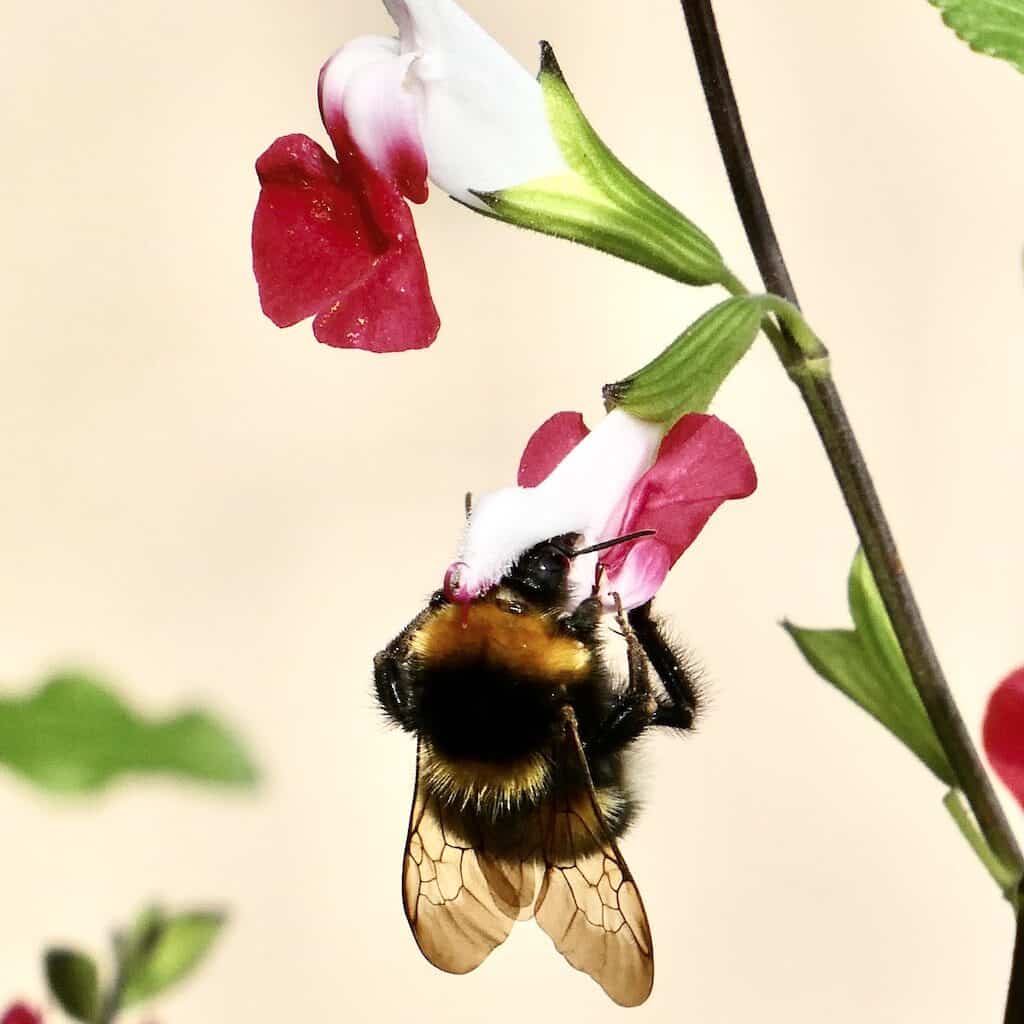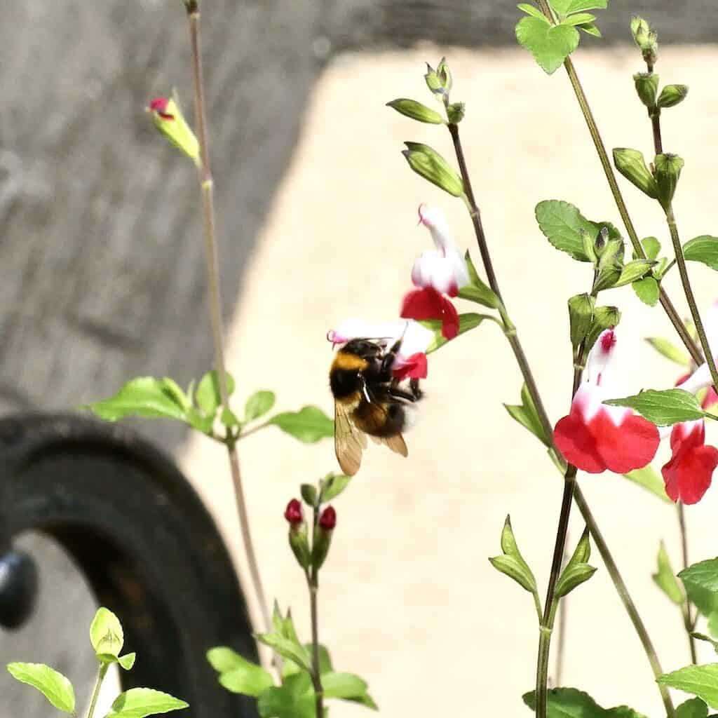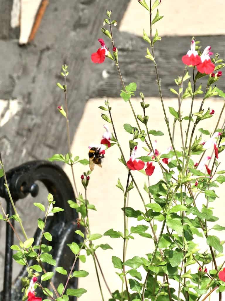 In einem der Gärten blüht leuchtend rot ein Strauch Johannisbeersalbei.