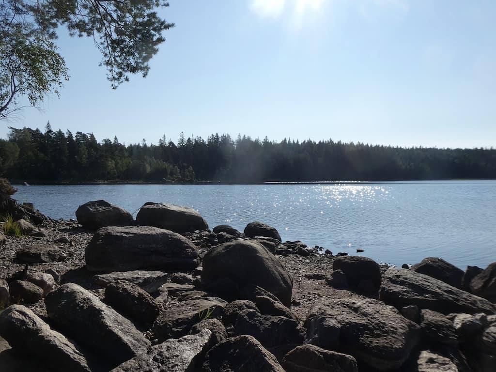 In Sichtweite eines kleinen Sees halten wir an und spazieren durch den Wald zum Wasser.