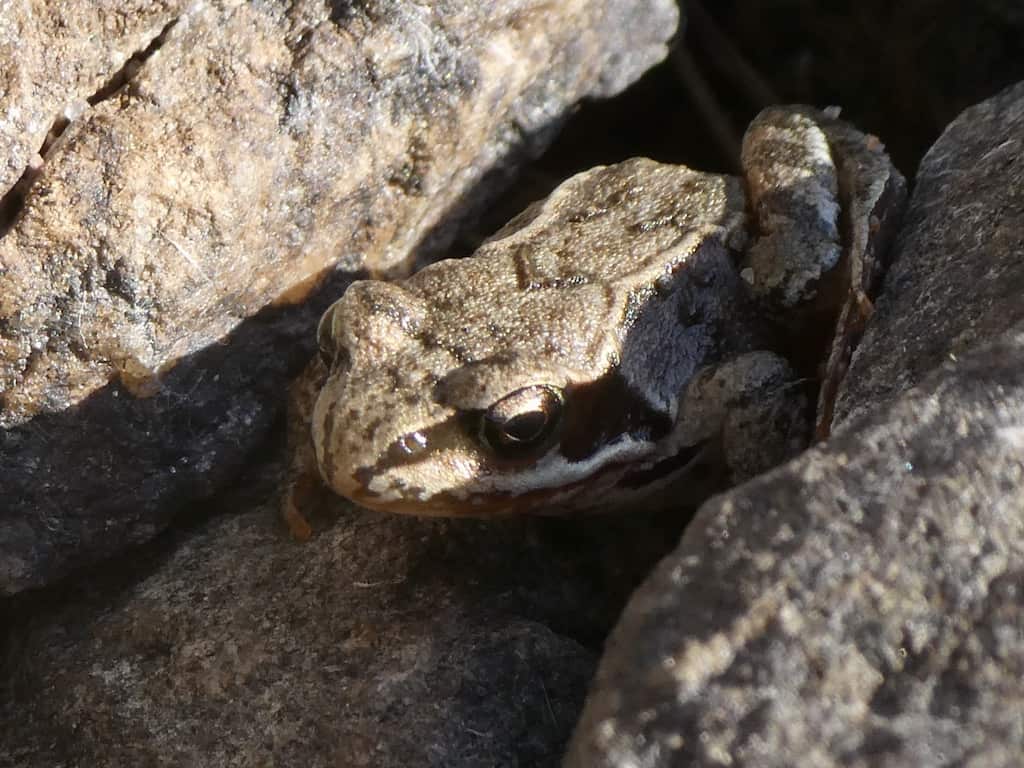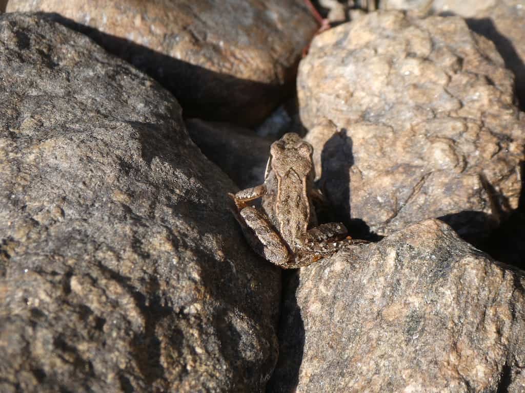 Ein winziger Frosch kommt an Land.