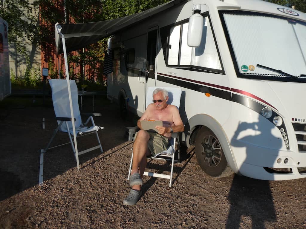 Wir machen es uns gemütlich, geniessen das schöne Wetter und haben viel Zeit zum Lesen und Kreuzworträtseln, während Waschmaschine und der Tumbler für uns arbeiten. Michael nützt auch das freie WLAN, um einiges nachzulesen. Alles was bisher unterdrückt wurde, um Daten zu sparen.