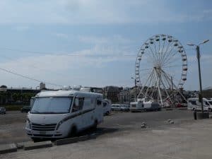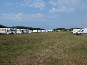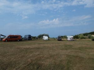 Ein riesiger Parkplatz auf einer Wiese oberhalb der Klippen bei Veules-les-Roses mit etwa 50 Campern. Ein Hinweisschild untersagt zwar das Parken von 23 bis 8 Uhr, aber alle bleiben über Nacht stehen. Das wird hier offenbar nicht so eng gesehen.