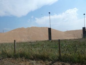 Am Wegrand türmen sich Berge von Getreide.