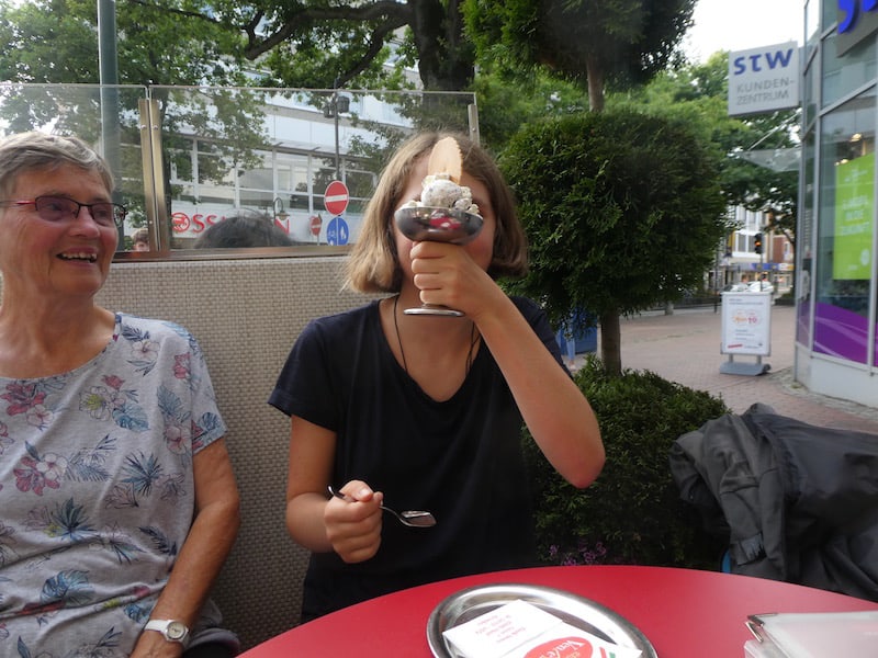 In Wedel gehen wir zuerst einmal zum „Italiener“ und zelebrieren das Wiedersehen mit einem Eisbecher.