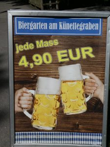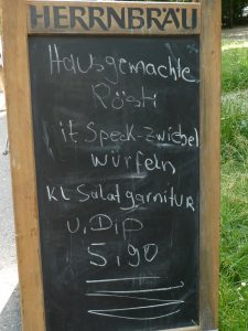 Hier gäbe es Bier, die Mass für € 4.90, und für wenig mehr sogar eine hausgemachte Röschti mit Speck und Salat.