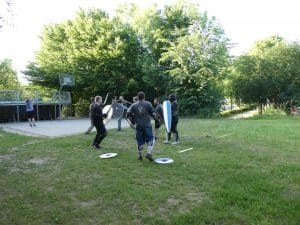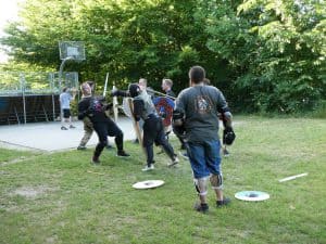 Auf dem Rückweg hörten wir Kampfgeräusche. Hier tobten sich die „Schanzer Freikämpfer Ingolstadt“ mit historischen Waffen und vollem Einsatz aus.