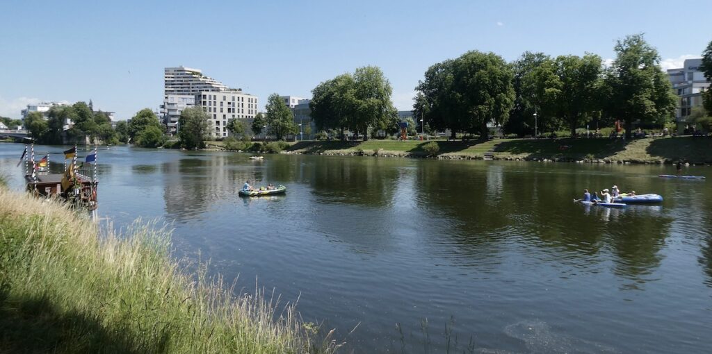 An und auf der Donau ist heute reges Treiben. Wir suchen aber eher eine Bank im Schatten. Der Fluss ist hier die Grenze zu Bayern.