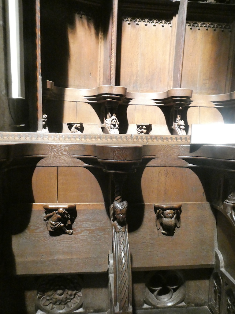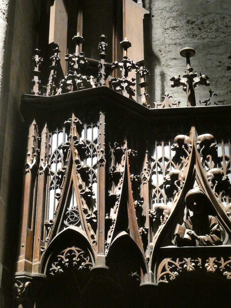 Wunderschön sind auch die Schnitzereien. Wobei diese Figuren im Chorgestühl im Rücken sicher nicht sehr angenehm sind.