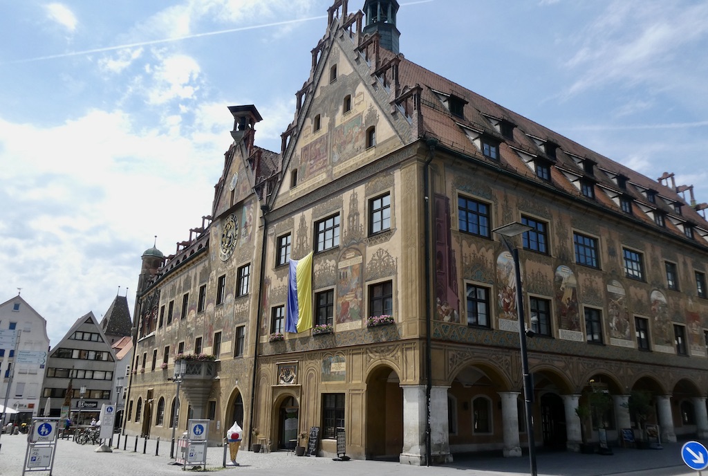 Zuerst kommen wir aber noch am Rathaus vorbei. Es fällt mit seinen Fassaden-Wandmalereien auf.