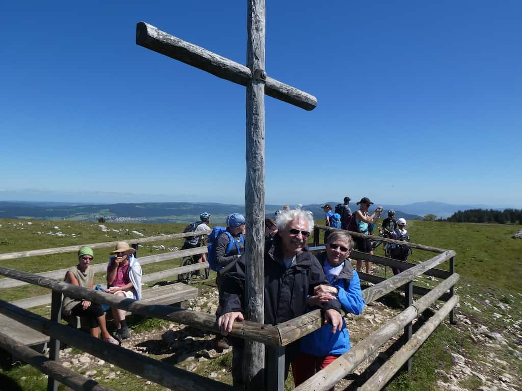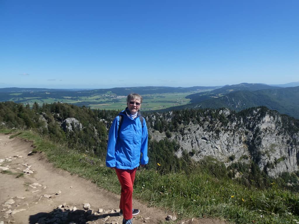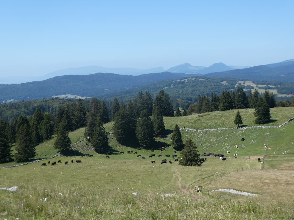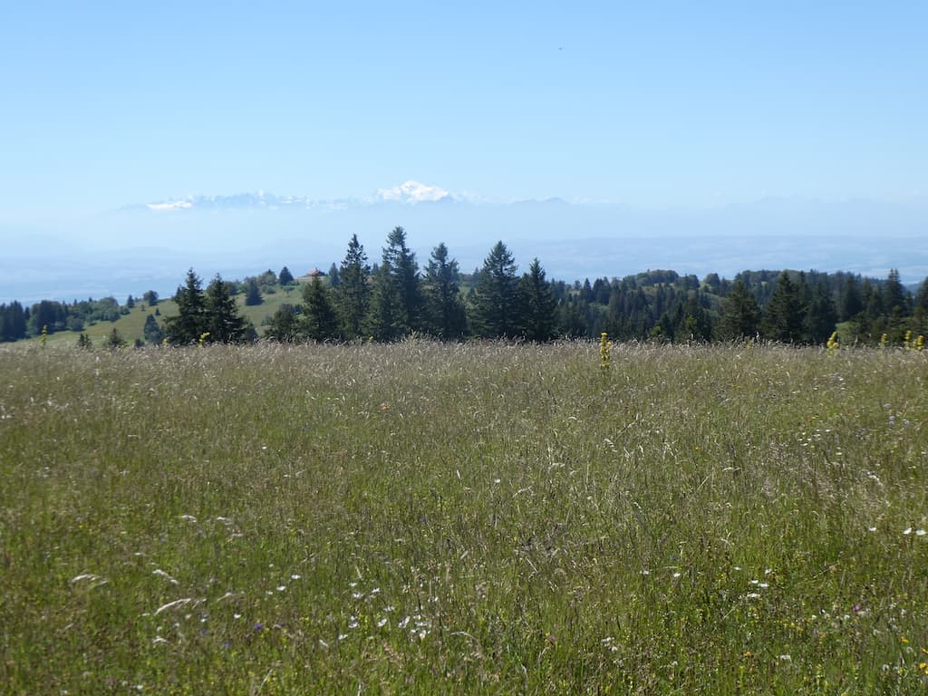 Auf bewussten Umwegen spazieren wir langsam über die Juraweiden zurück. Noch einige Zeit können wir die Alpenkette sehen.