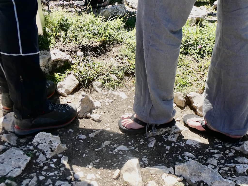 Wir sind hier zwar nicht in schwierigem Gelände, aber hier kommt eine Frau (keine Japanerin) tatsächlich in Badelatschen an. Ihr Begleiter als Kontrastprogramm hingegen mit Bergschuhen.