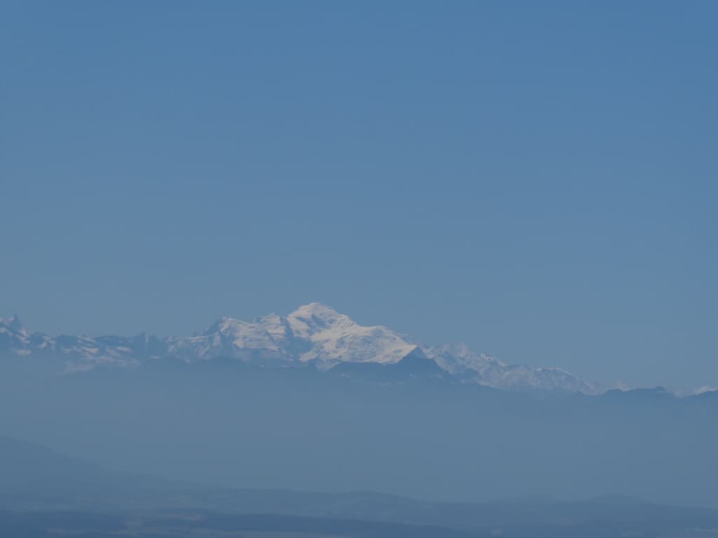 Von links die bis zu 4200 Meter hohen Berner Alpen bis nach rechts die 4800 Meter hohe Mont-Blanc-Gruppe in den französischen Alpen.