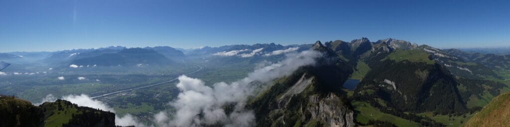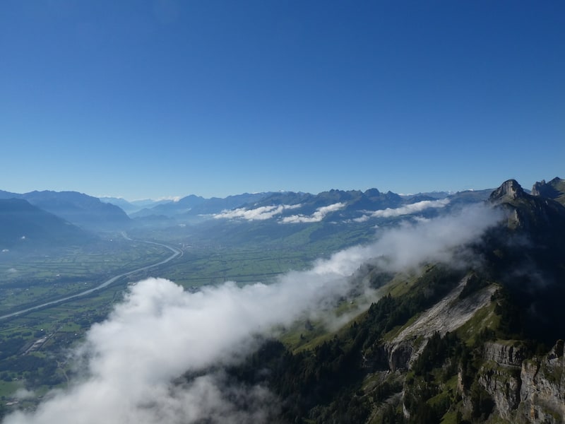 Wir geniessen eine atemberaubende Rundsicht. Sechs Länder sollen es sein: CH, FL, DE, A, I, FR. Das Rheintal liegt klar vor uns. Auch Richtung Säntis, wo wir kürzlich waren, ist die Sicht sehr gut. Aber den weiter entfernten Bodensee kann man nur erahnen.