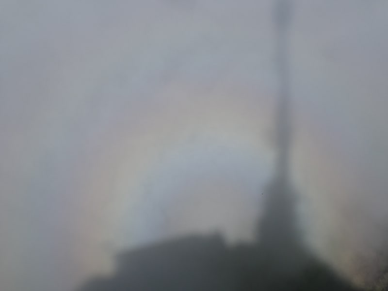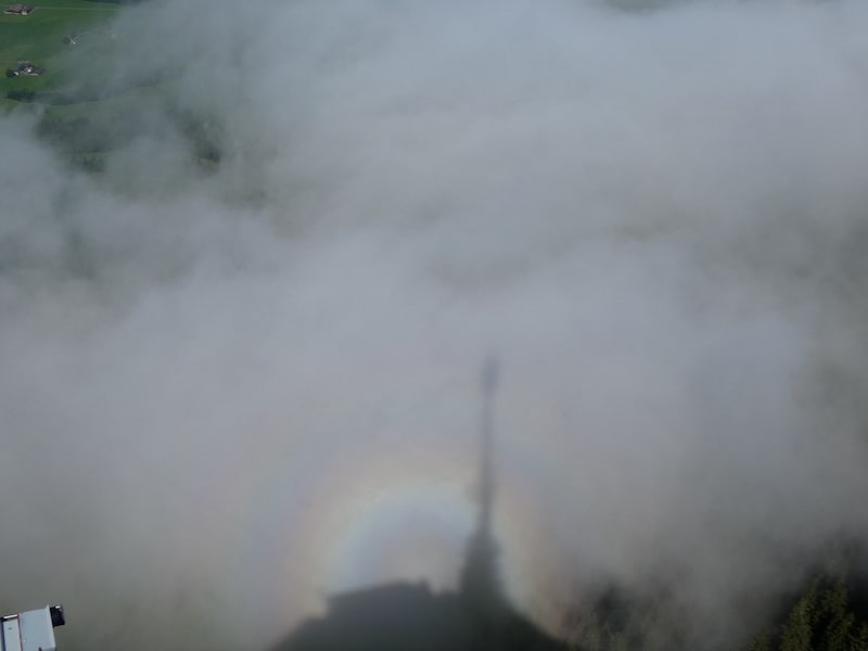 In den aufziehenden Nebelschwaden bildet sich ein Regenbogen