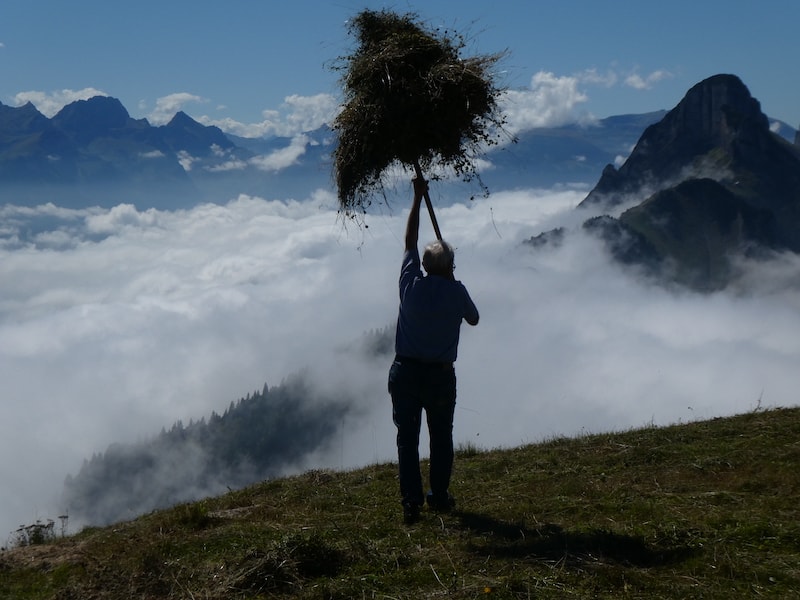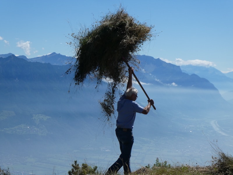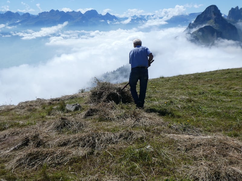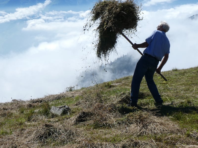 Wir bewundern einen älteren, aber topfitten Bergbauern beim Heuen.
