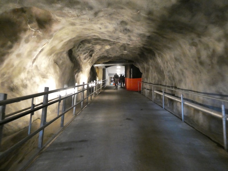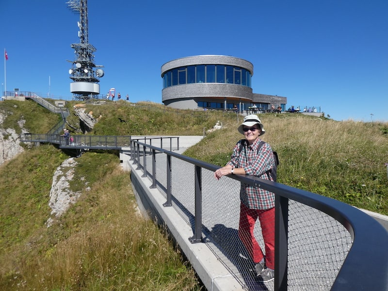 Oben gelangen wir durch einen Tunnel im Felsen zum Ausgang. Hier beginnt ein Gipfelrundweg rund um das Drehrestaurant.